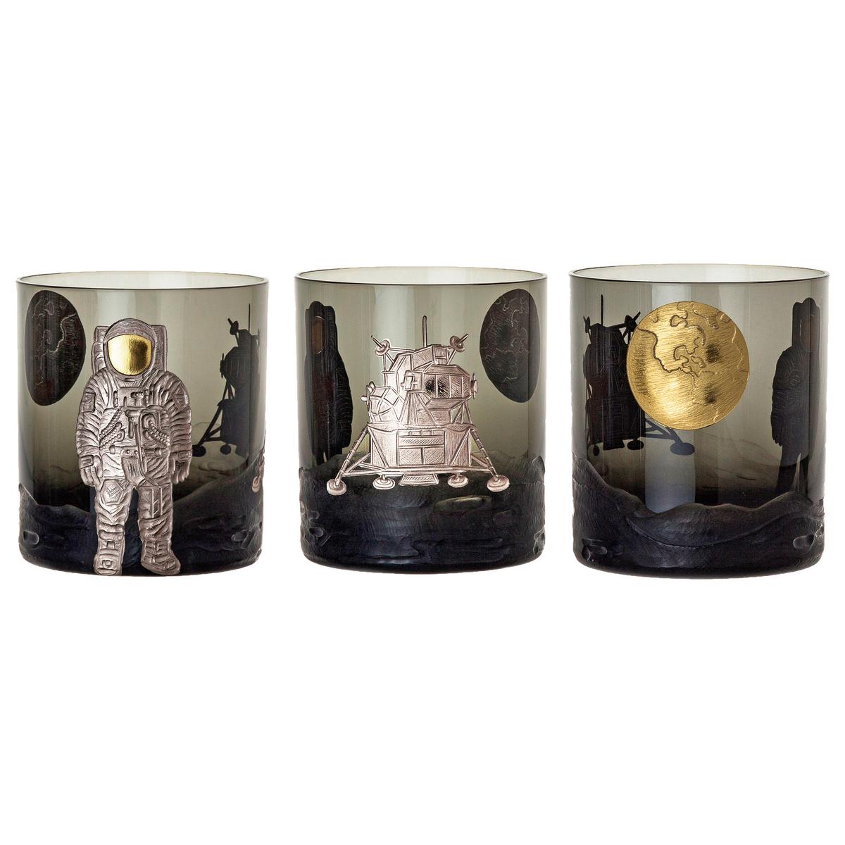 Named for the Cold War era of competition between the USA and USSR over spaceflight capability, the "Space Race" glass collection by Artel is comprised of two separate motifs: "Sputnik" features an image of the famous Soviet satellite in flight, careening past glittering gold stars and planets, while "Apollo 11" depicts a space-suited American astronaut standing near a lunar landing module with a magnificent earthrise looming in the background.