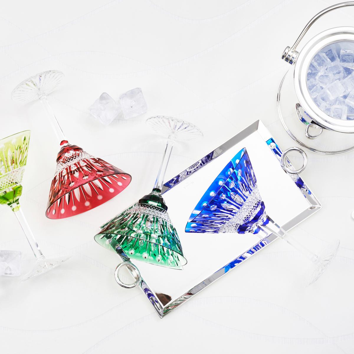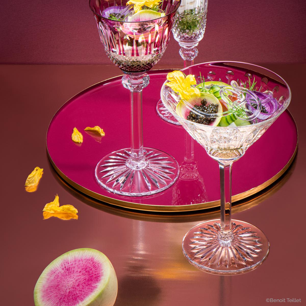Richly detailed cutting is what makes the coloured crystal of these glasses glitter like diamonds. Indeed, to produce this effect, as many as three intricate glass-making techniques are necessary: facet cutting, ball cutting and diamond cutting. The cocktail glasses are part of the “Tommy” collection which is one of the most important and famous product lines of the French manufactory Saint-Louis. This fame may also be due to a nice anecdote entwined around this classic series from the year 1928: on the occasion of a visit by King George VI, a “dinner” was given in the Hall of Mirrors at Versailles, and the place of each guest was set with eleven glasses of the “Tommy” series. Each of these glasses is still produced today in France’s oldest crystal glass factory with all the traditional skill and precise craftsmanship. Further articles from the “Tommy” series can be viewed below.