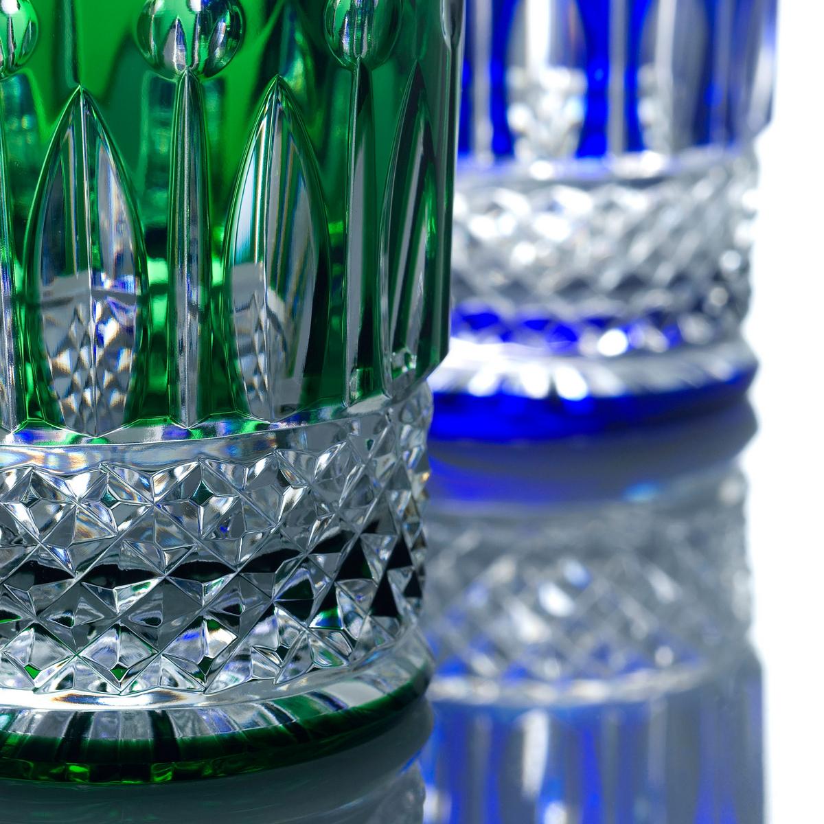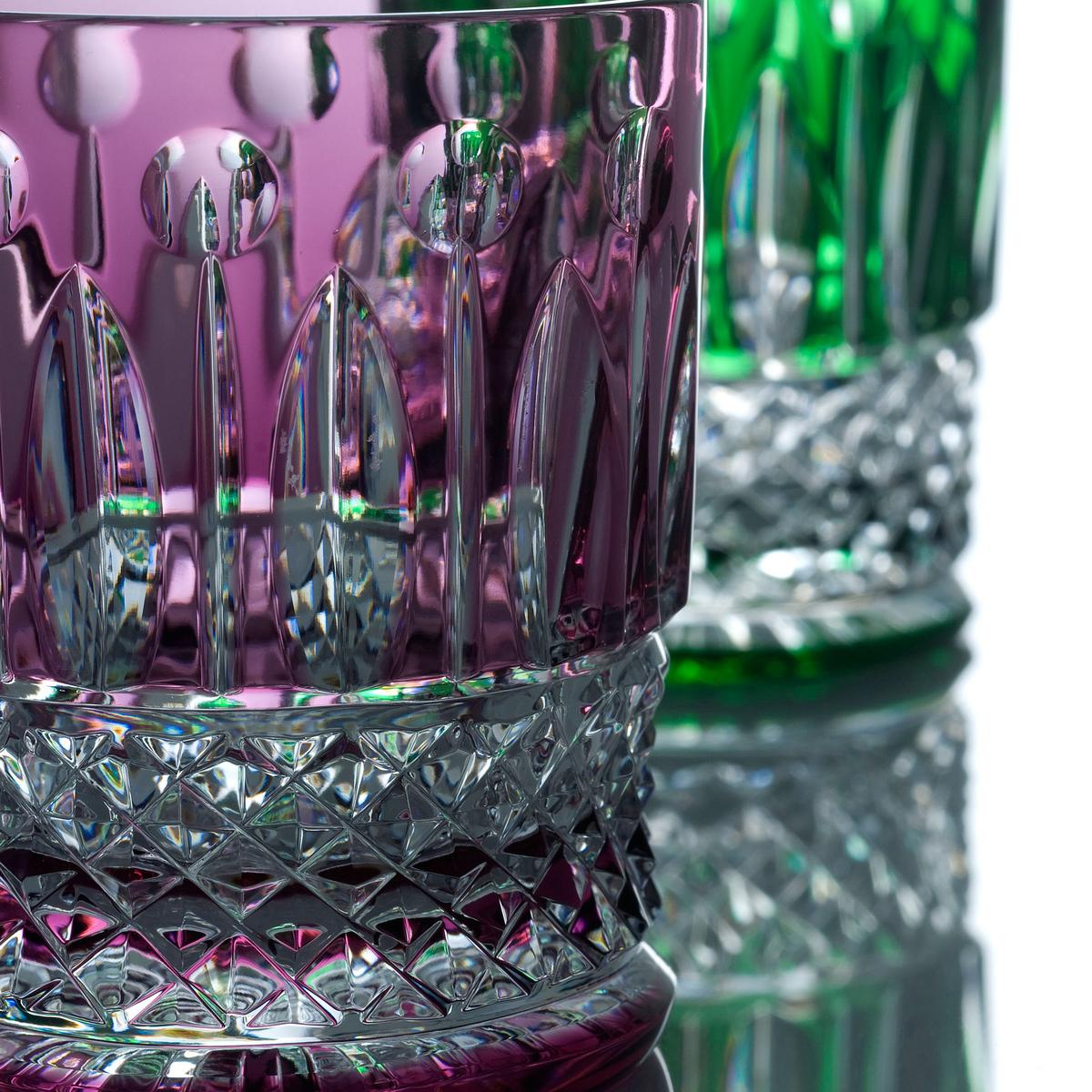 The “Tommy“ south wine tumblers crown a top-class meal. Skilled handcraftsmanship has achieved a result which means the coloured crystal sparkle like diamonds. Designed in 1928, these small glasses are part of the “Tommy” collection, one of the most important and famous glassware ranges of the Saint-Louis Cristallerie. Three of the intricate techniques of the manufacturer are necessary to produce one glass: facet cut, ball cut and diamond cut. This classic design made its historical “coming out” during a dinner which took place in 1938. On the occasion of a visit by King George VI, each guest in the mirrored dining room of Versailles Palace sat down at a place-setting which included eleven glasses from the “Tommy” glassware. Each of these glasses is still being produced with the same skill and attention to detail at France’s oldest glass manufacturer. Each glass is mouthblown and hand-cut and polished. Further "Tommy" items below.