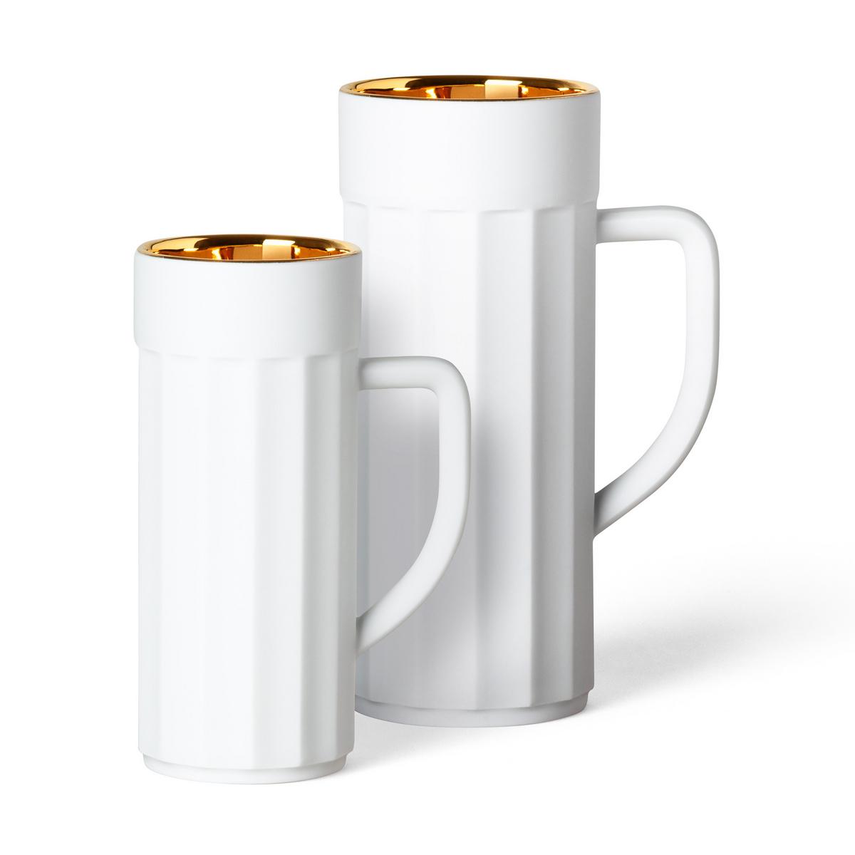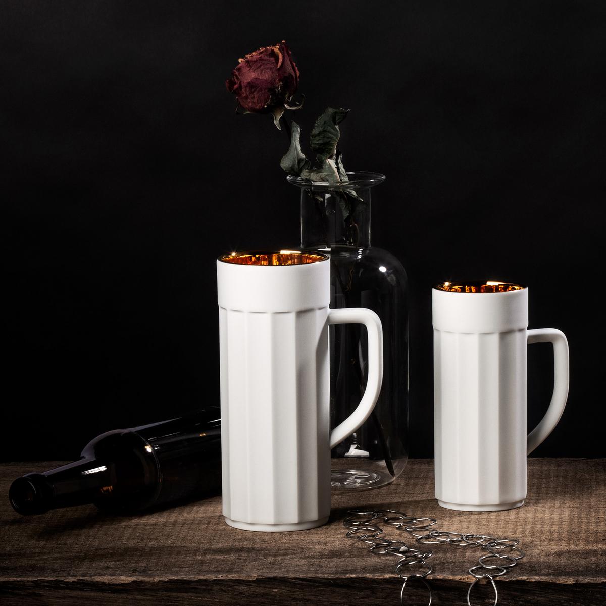 The exterior wall is also appealing to the touch: the matt-finished surface makes the special quality of handmade porcelain visible and perceptible. The highlight, however, is the 24 carat gold plating on the inside. The gilded interior of the beer tankards not only looks luxurious, it also inspires every beer lover: in combination with the gold-coloured beer, it creates a sparkling glow under the foam crown.