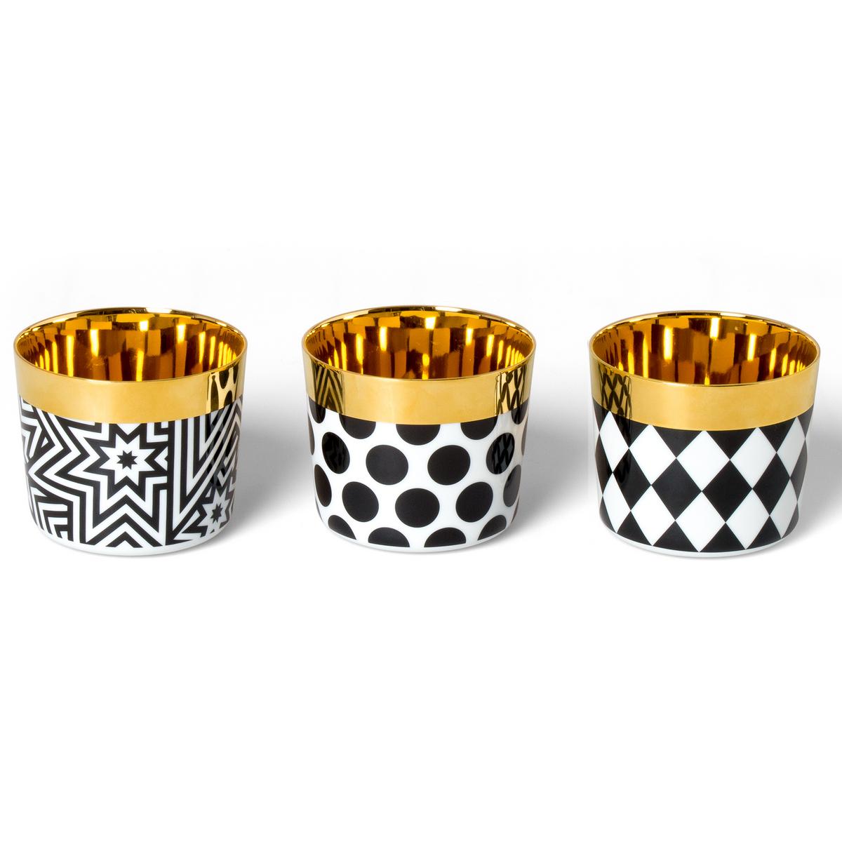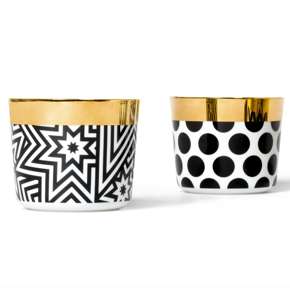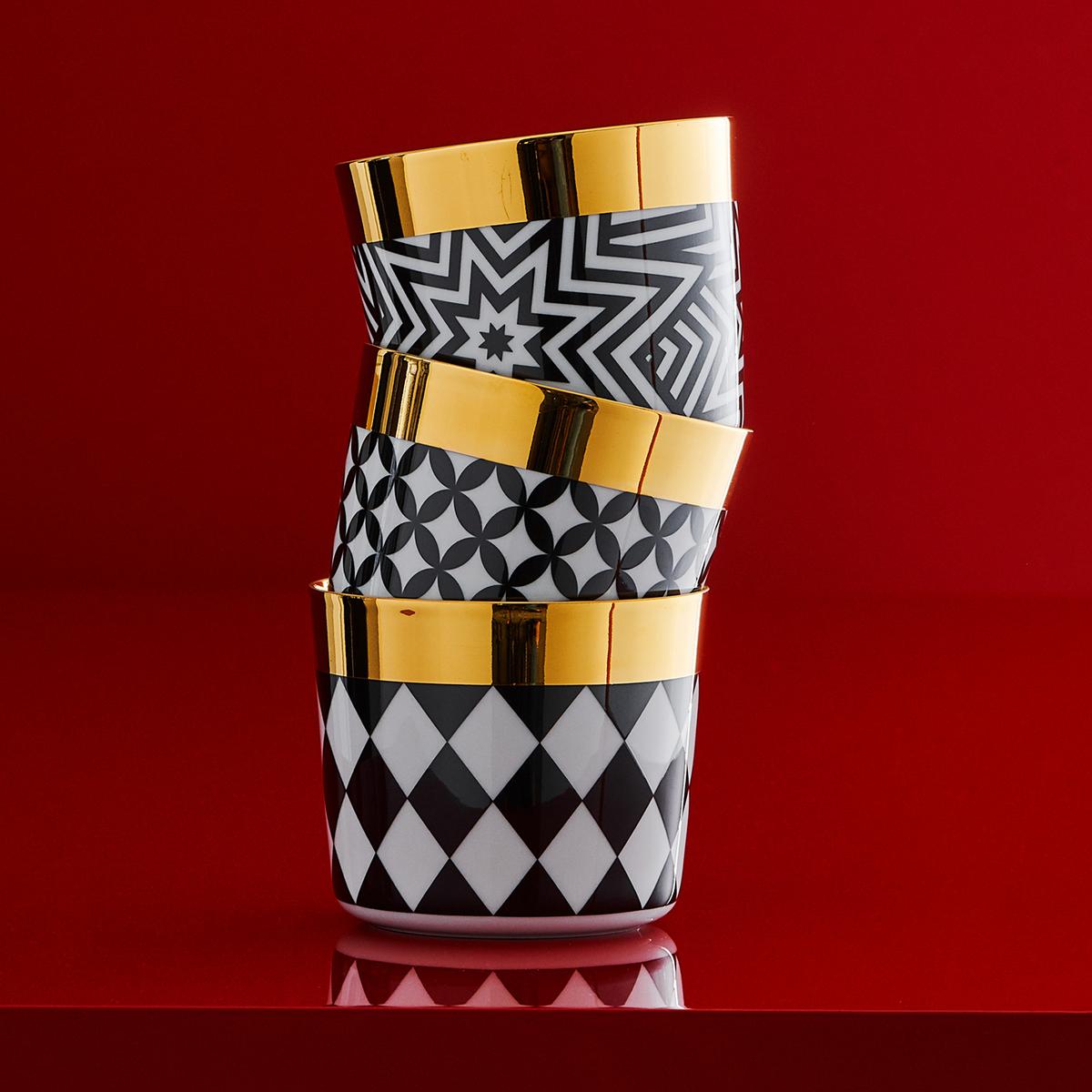 The "Sip of Gold Black & White" Champagne goblets combine gleaming precious metal with coal black and snow white. Sparkling contrasts are produced by the engraved stars and dots, crystal-like diamond- shaped patterns and eye-catching rhombuses. These goblets can be combined wonderfully with other designs from the “Sip of Gold” line.