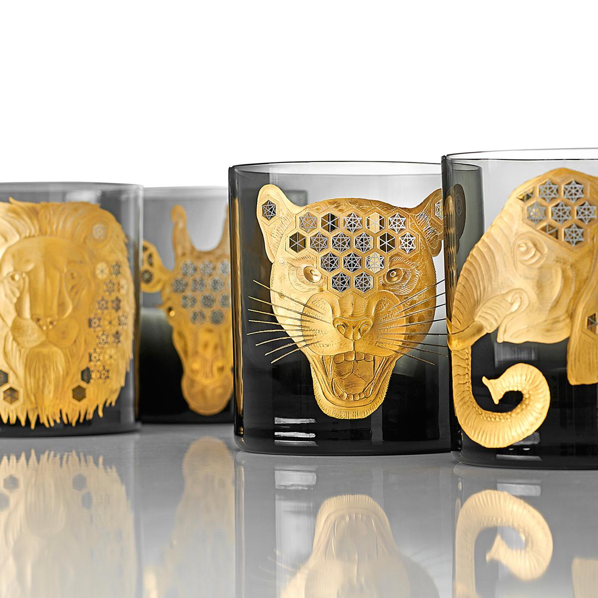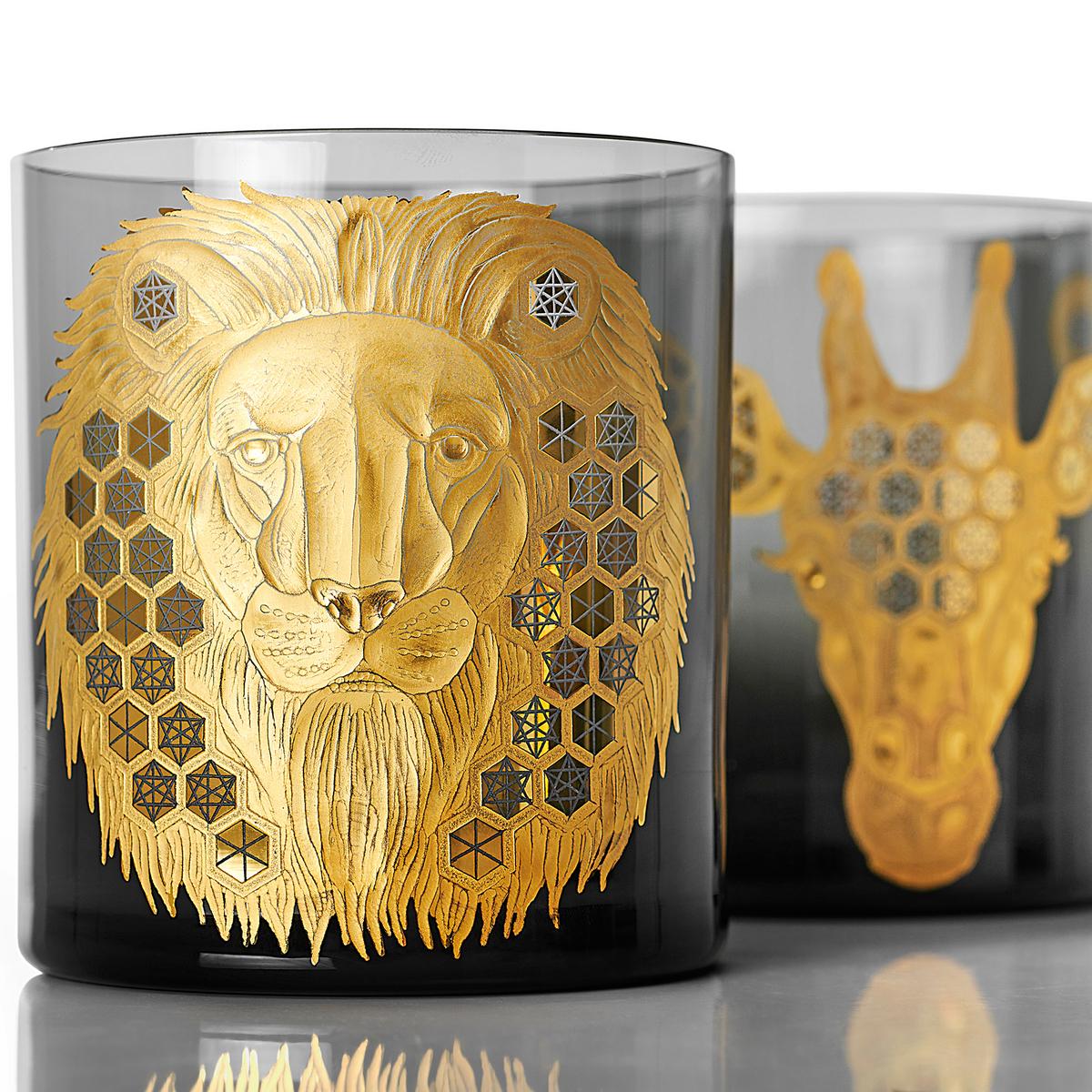 The "African Safari Gilded" collection by Artel evokes the safari experience for adventurers and armchair travelers alike with ten different exotic animal head motifs. The detailed images of the animal heads are particularly impressive. Each animal is engraved by hand into the glass. Sandblasted geometric shapes add extra excitement to the design. Finally, each animal is hand-gilded with 24-carat gold to create a breathtaking impression.