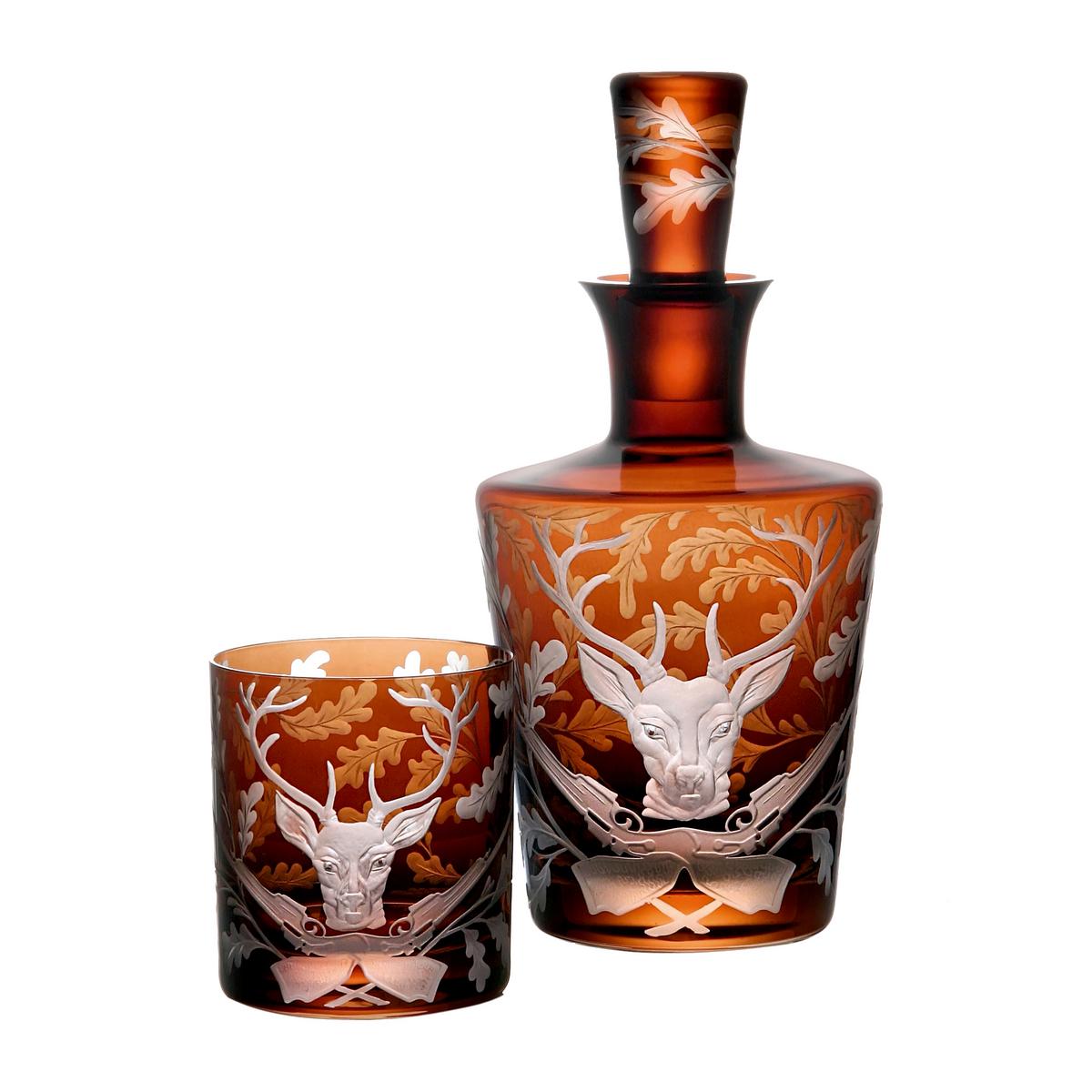 The "Forest Folly" whiskey glasses from Artel show five popular hunting trophies: from boar to hare, and then a hunting dog carrying his quarry. Two guns embedded in the oak leaves finish of this hunting story in an artistic way.