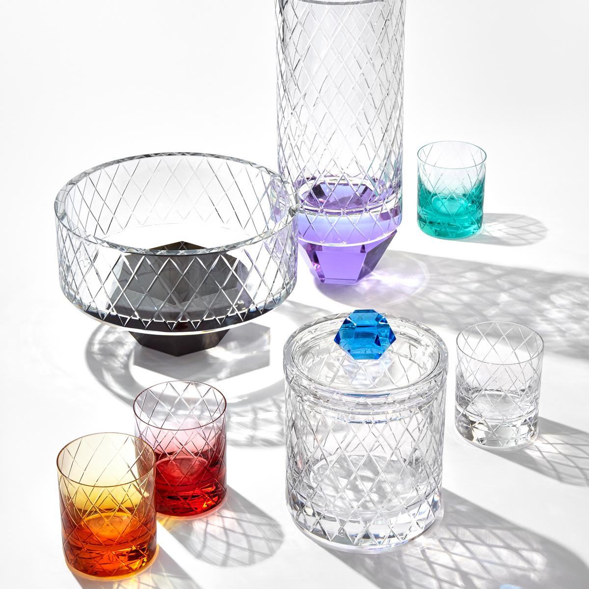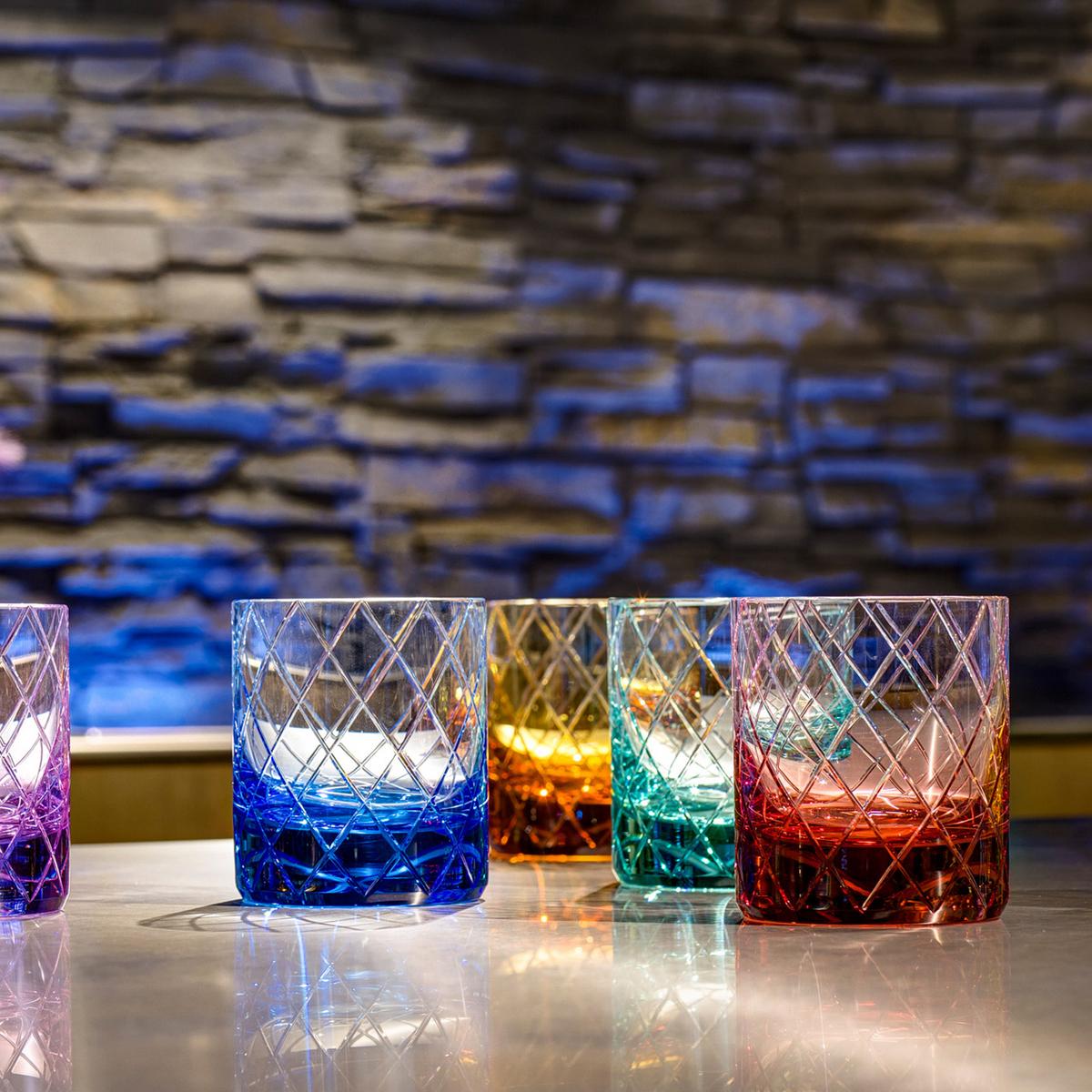 The "Bonbon" coloured glasses by Moser have a strong base of crystal glass and fine glass walls. Tiny edges cut into the crystal emphasize the contrast between craft and clean design.