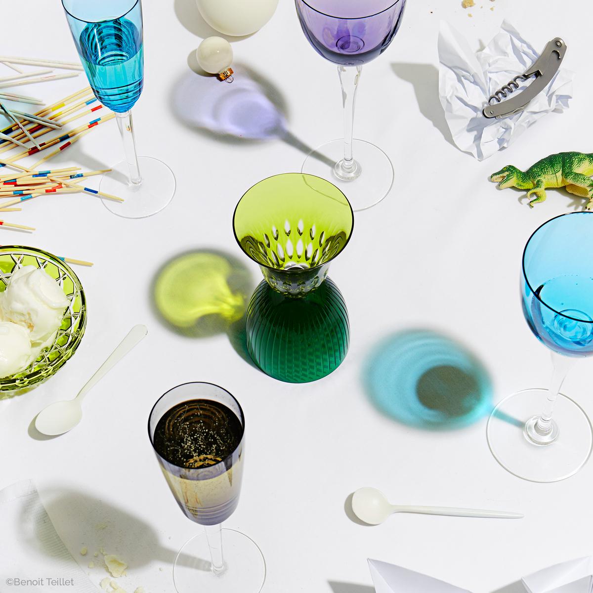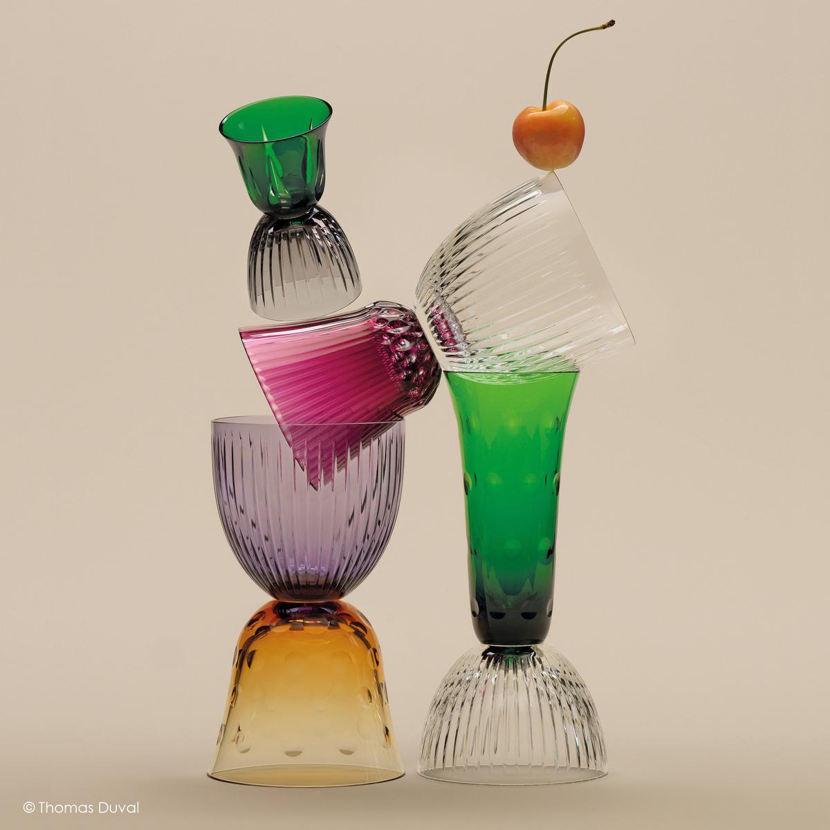 These eye-catching glasses from the Cristallerie Saint-Louis guarantee top service even when they are turned upside down. That is because the bowl and foot of these fascinatingly alluring pieces from the "Les Endiablés" collection are happy to exchange roles. Created by designer José Lévy, these extraordinary crystal glass vessels display explosive colours in the popular Saint-Louis series Stella, Bubbles, Tommy, Chambord and Cerdagne.