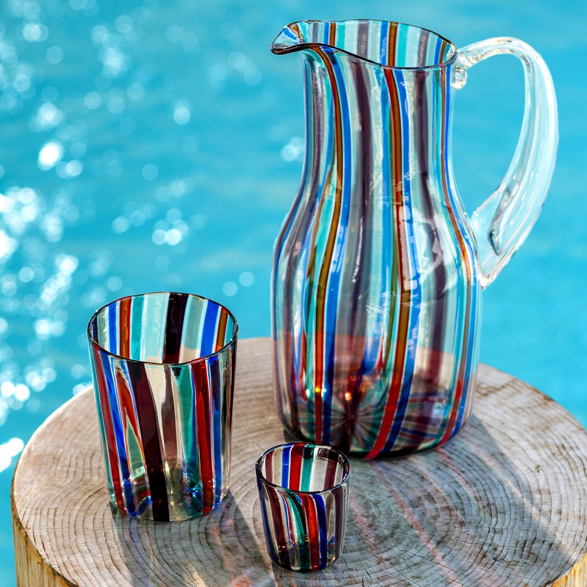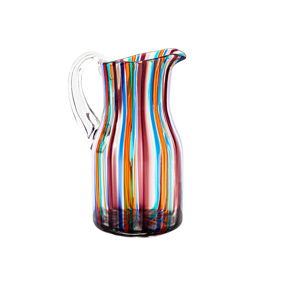 The quintessence of Murano glass. The "A Canne" jug is a re-edition of a design that the legendary designer Gio Ponti created for Venini in 1946 for the 1952 Venice Biennale. The six glass colours grey, red, sapphire, green, straw yellow, and amethyst combine on the jug's simple and elegant silhouette to form a kaleidoscopic striped pattern that is slightly different on each individual piece.