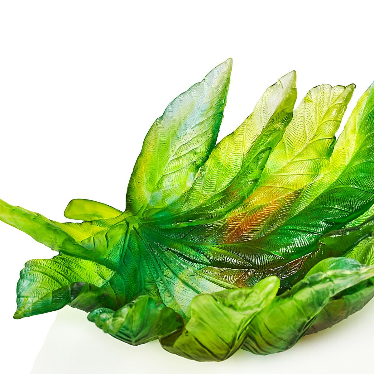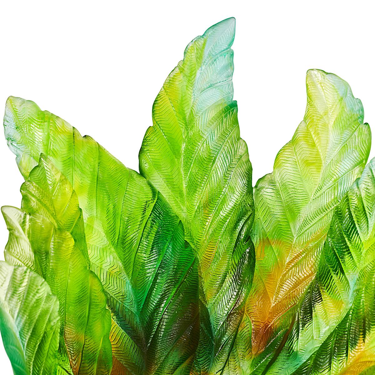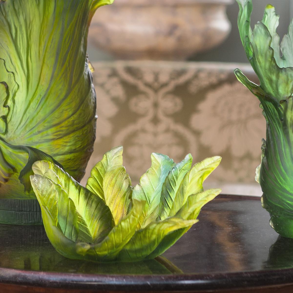 The gradations of green tones seem almost like an impressionistic painting. The colour gradient is determined by the manufacturing process. The Daum manufactory creates unique objects from so-called crystal glass paste. Each product is produced by hand and is therefore unique. The velvety surface is another advantage of working with crystal glass paste. Small air bubbles enclosed in the glass are possible and a sign of this special manufacturing process.