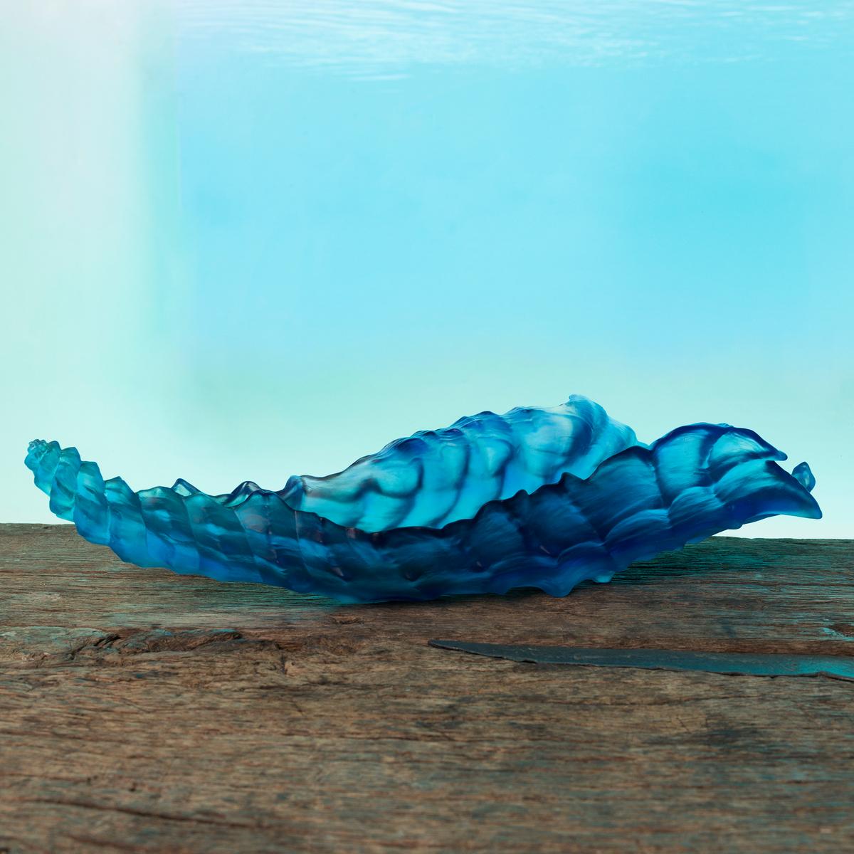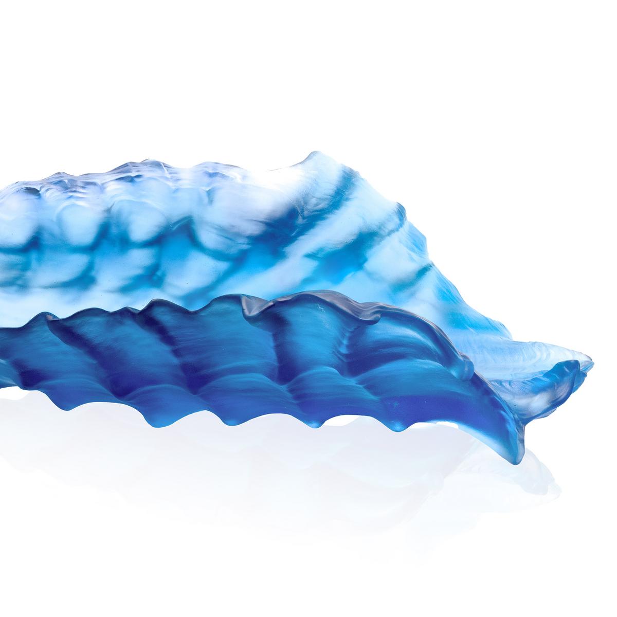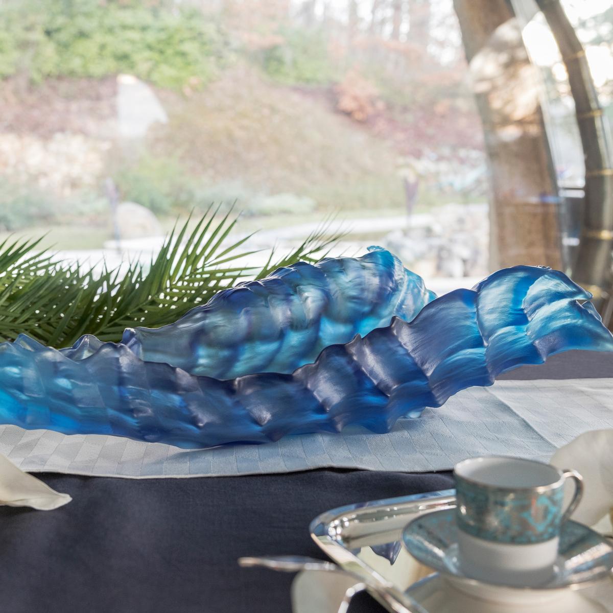 The "Mer de Corail" centrepiece by Daum weighs 9.3 kg and is 71 cm long and is an impressive decorative object in wonderful shades of blue. Each centerpiece is crafted by hand at the French manufactory Daum using a single crystal glass paste (pâte de verre) and is thus absolutely unique. Crystal-glass paste is made of a complex blend of crystal and lead granulate. The mixture can be kneaded like wax in the hands of the skilled glass artists. The result is exceptional shapes, a wonderful interplay of colours and contours that flow into one another. Little air bubbles captured in the glass are evidence of this special manufacturing process.