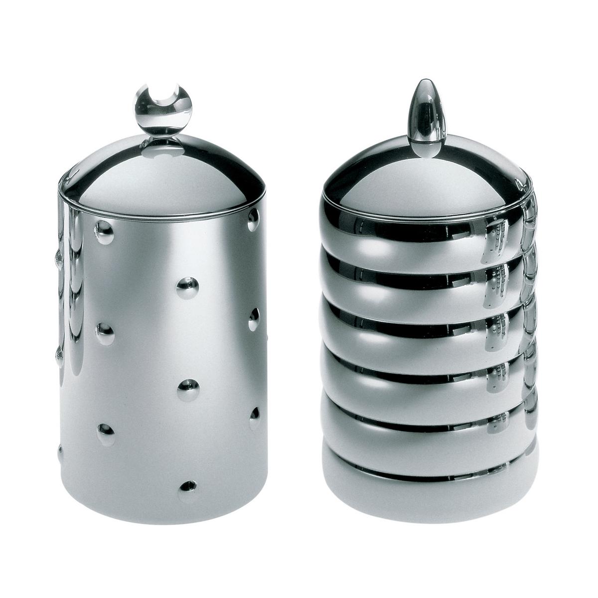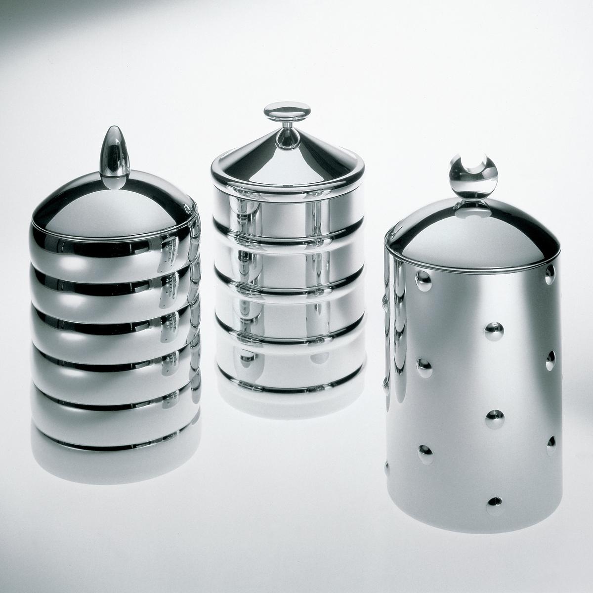 The designer Clare Brass created the kitchen storage containers for Alessi. The tastefully designed kitchen boxes are made of mirror-polished, stainless steel. Stainless steel is particularly durable and resistant to corrosion.