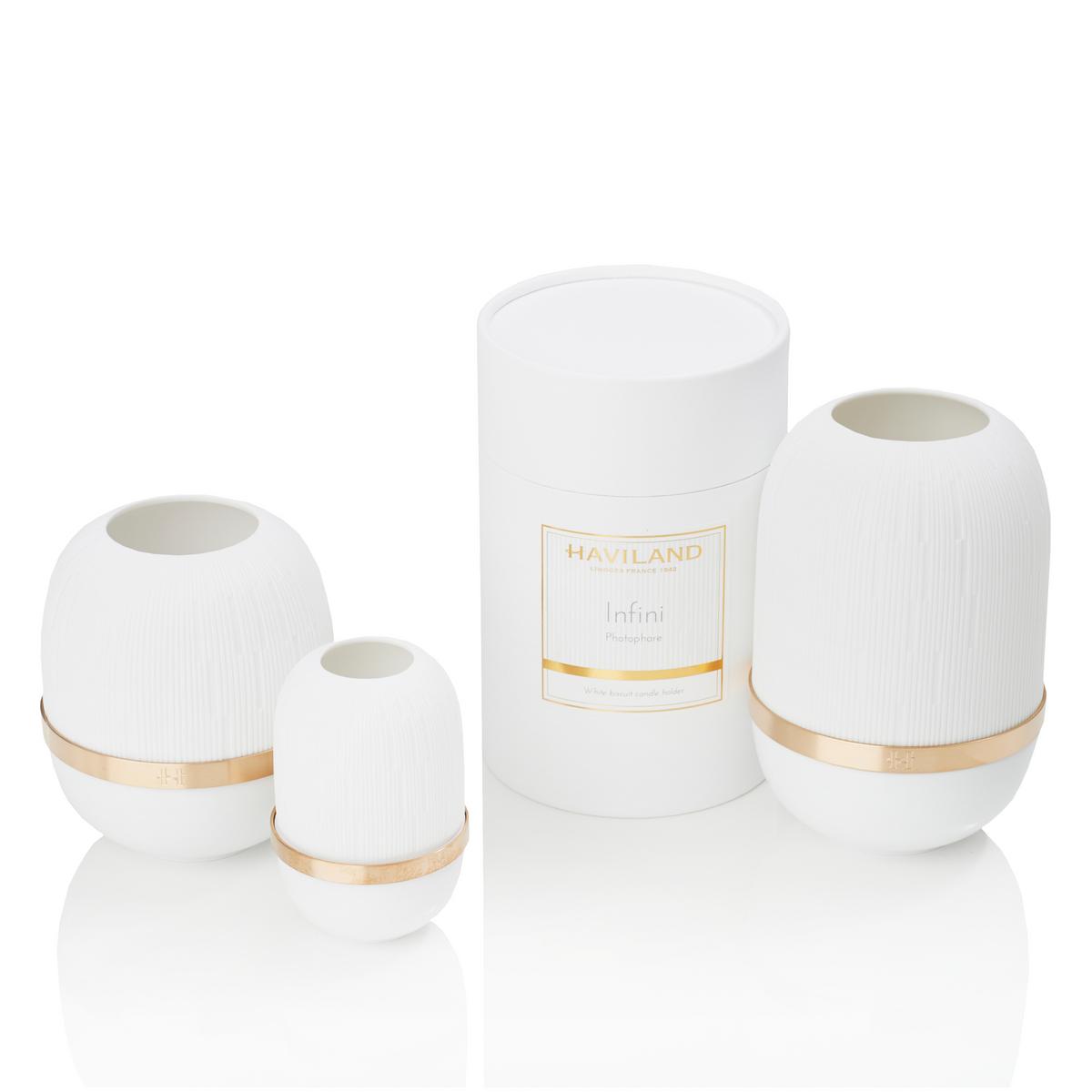 The elegant "Infini” tea light holders from Haviland are made of unglazed, velvety soft bisque porcelain. "Engraved" in the bisque porcelain is a handcrafted relief pattern, comprising of stripes of varying lengths. As soon as the "Infini" tea light from Haviland is lit, the transparency of the fine porcelain and the relief structure is clearly visible. Placed on the table or around the room, the Haviland tea lights provide an atmospheric light.