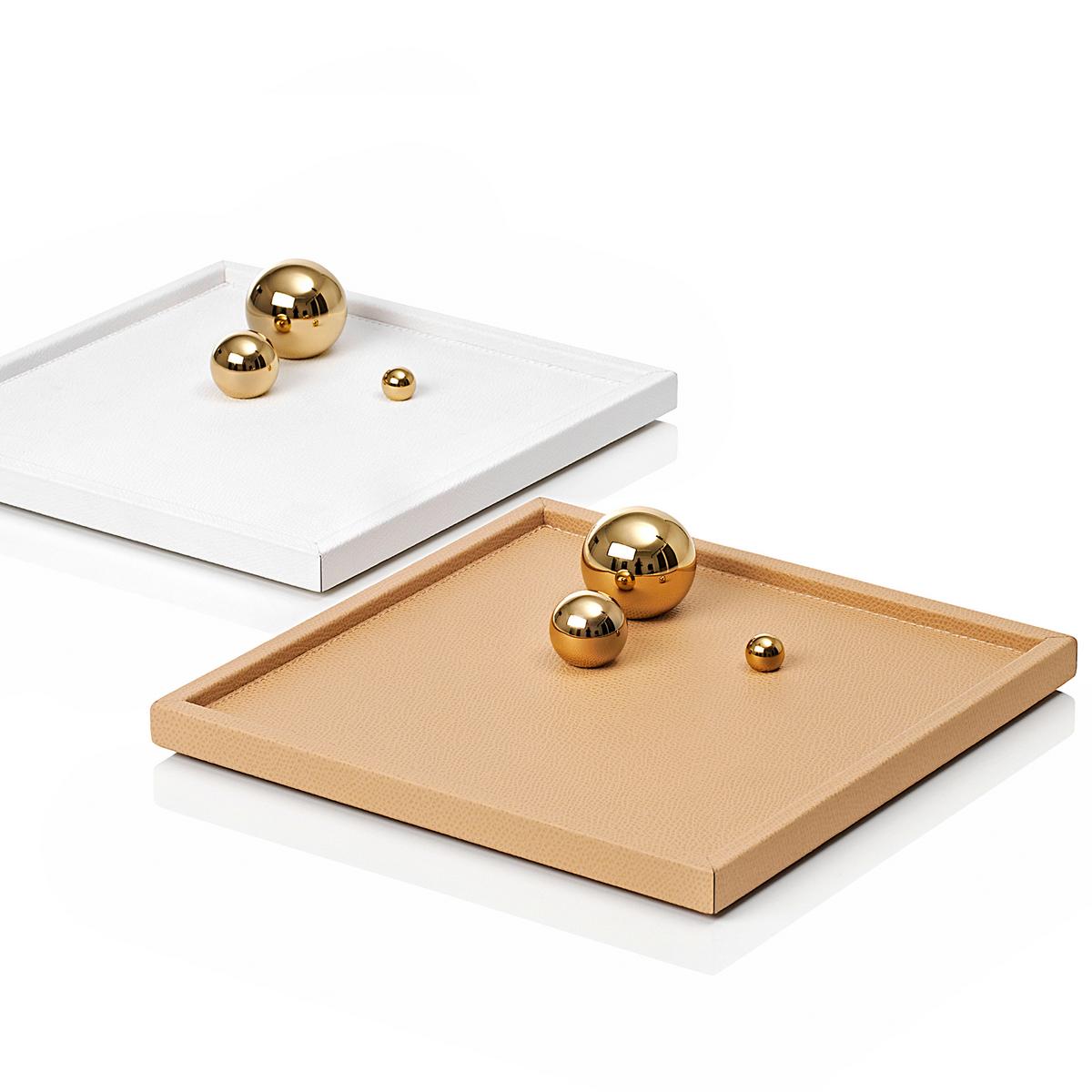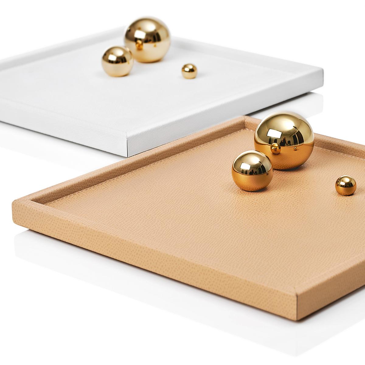 Contrasts between geometric shapes like a prism and a sphere have always fascinated the human being. For the "Champagne" collection the designer Stephane Parmentier was inspired by this contrast. The golden spheres transform the simple tray into an element of decoration that invites to come closer and explore its shape and function. Their arrangement on the tray and the play with different sizes take their observer on a journey through metaphysical landscapes.