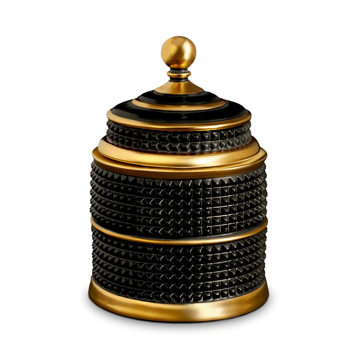 The impressive structure of the "Bibliothèque Gold" scented candle from L'Objet is made of the fine porcelain. The black container is refined with highlights of 24-carat gold which are applied exclusively by hand. The precious element of the "Bibliothèque Gold" scented candle lies hidden within the porcelain container: a candle which gives off a scent of "Pink Champagne" and with a burning time of about 40 hours. When the candle had burned down completely the container can still be of service to you in a variety of ways, for example as a safe place for your little mementos or as a storage jar for some of your precious jewellery.