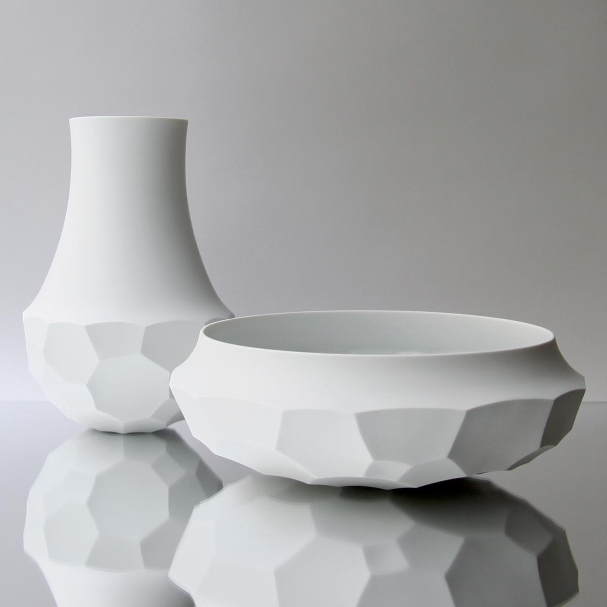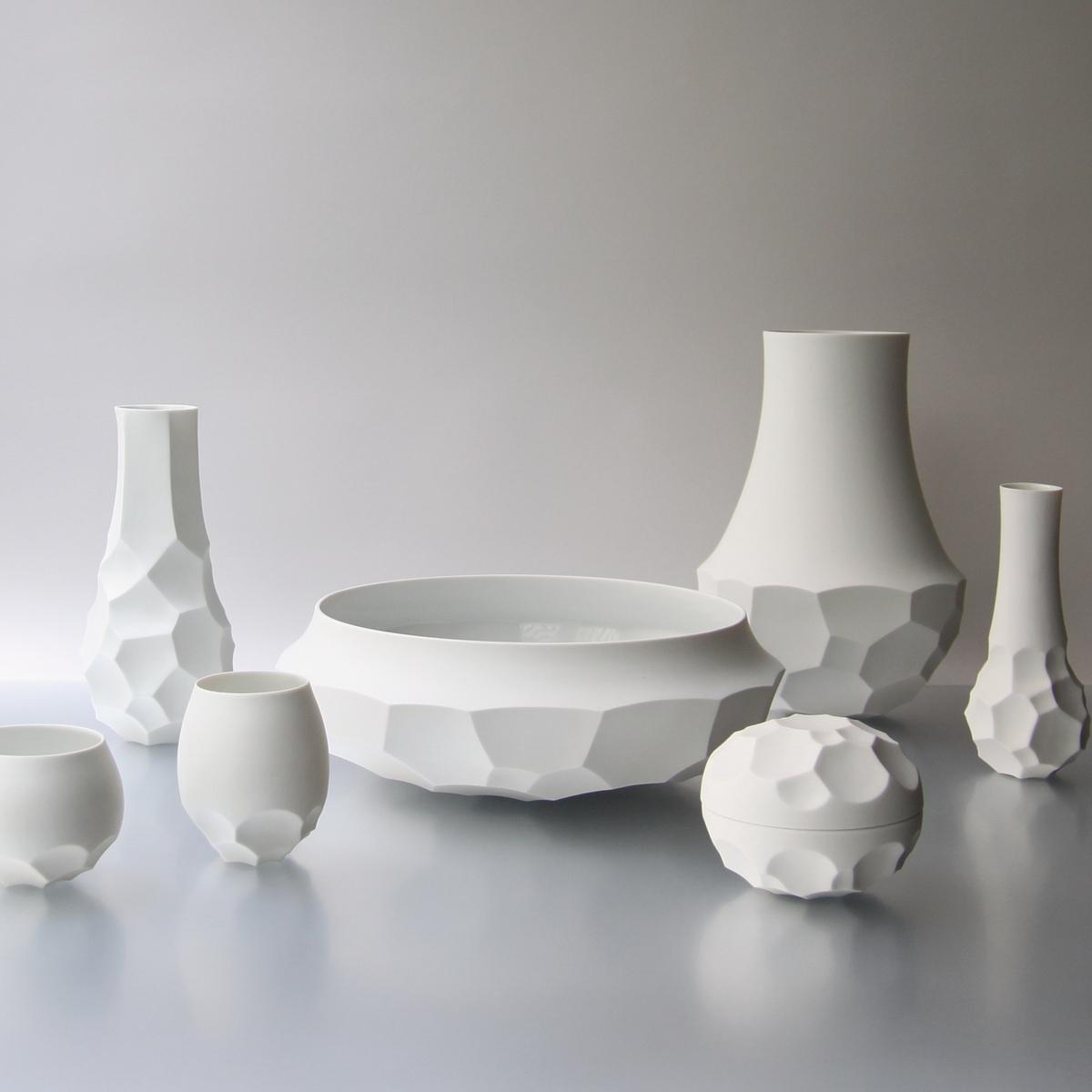 With "Tortoise" from the porcelain manufacturer Nymphenburg, the renowned designer has again managed to capture the play on light and shadow in the unique transparency of the Nymphenburg porcelain which is handcrafted step by step. The "Tortoise" series from Nymphenburg comprises a series of vases, a decorative bowl, a bonbonniere as well as two different drinking vessels. All the pieces are made of razor-thin bisque porcelain, matt on the outside and glazed inside.
