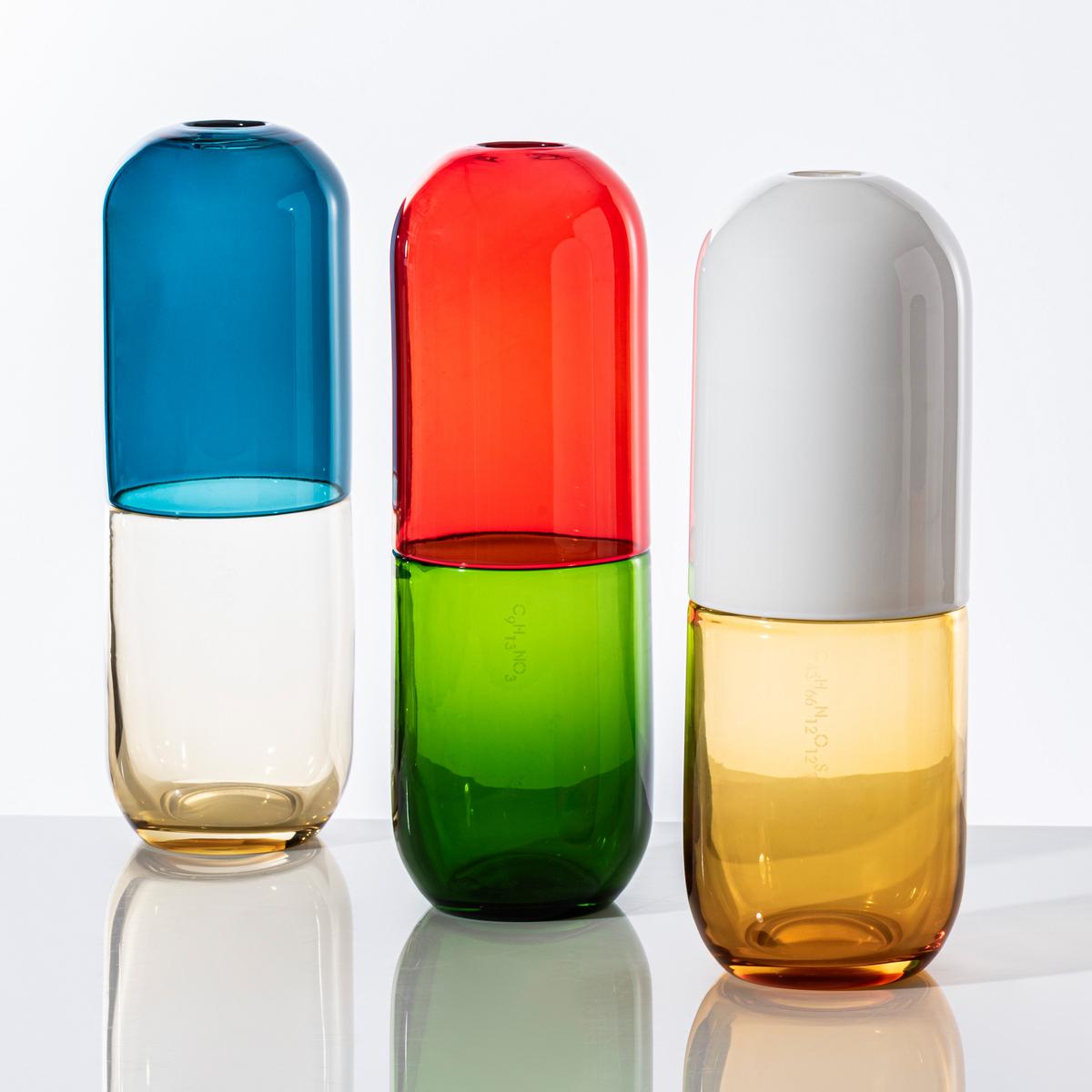 The mouth-blown Venini glass objects are very much art objects but that doesn’t mean they cannot be used as a vase. The shape and colour makes you think of "happy" pills from the pharmaceutical industry. Fabio Novembre's tongue-in-cheek idea was to show that playful design can have exactly the same effect as real pills. The result is five different colour combinations in radiant colours of Murano glass. The chemical formula of the happiness hormone is discreetly engraved on each vase.