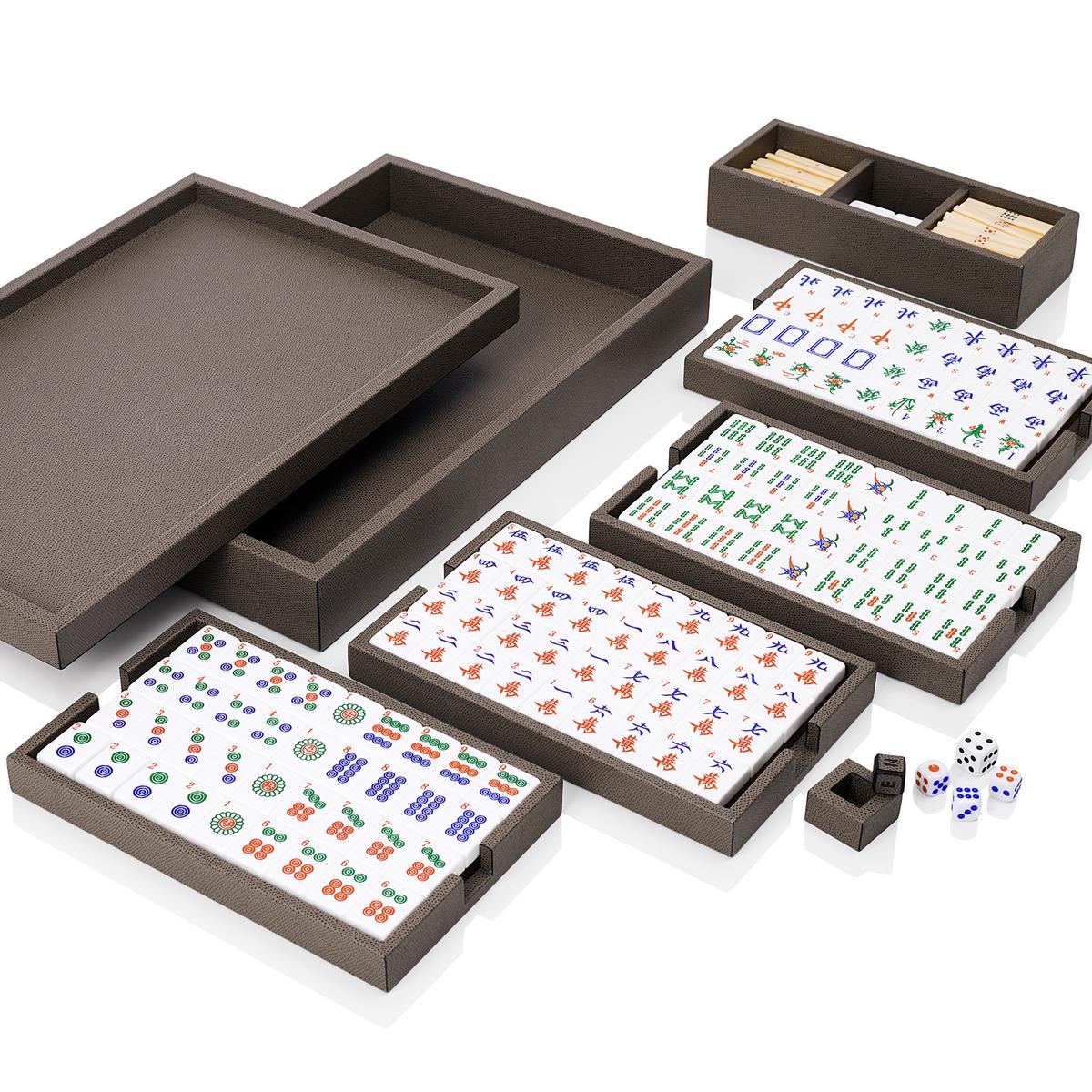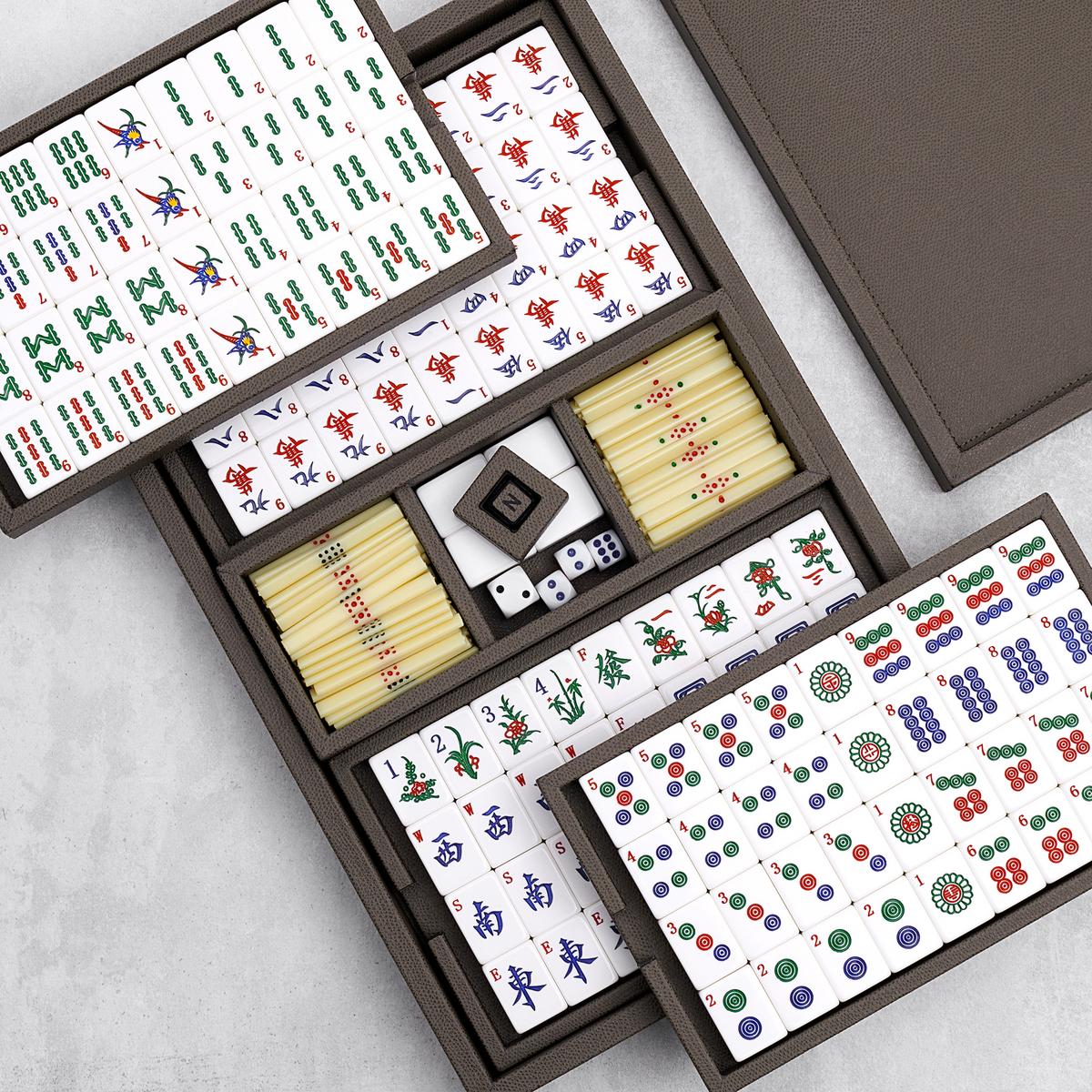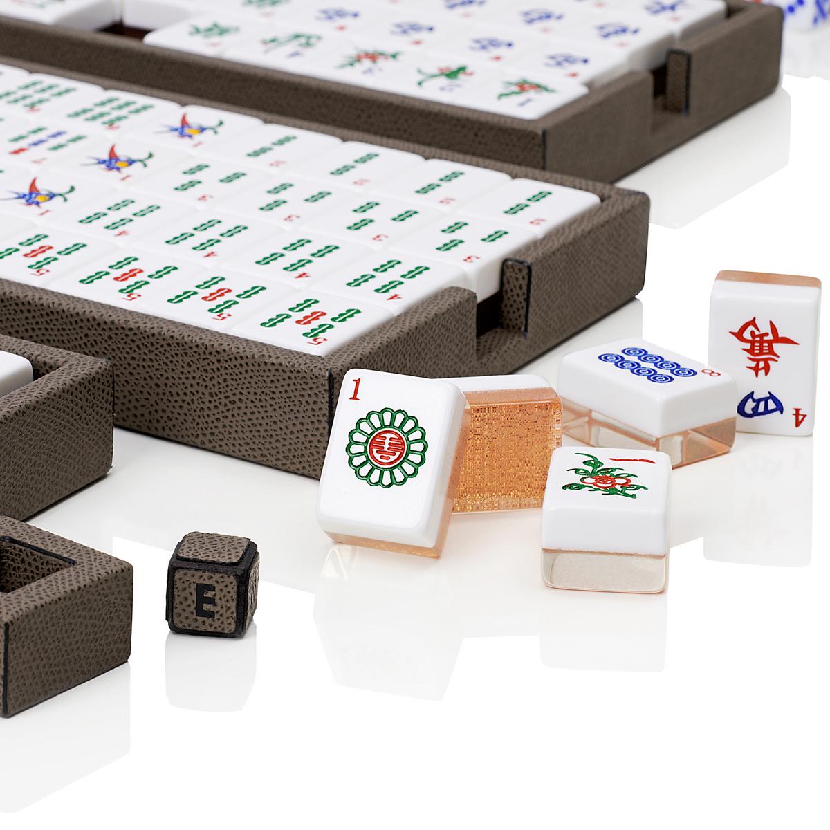 The Italian leather brand GioBagnara has designed a high-quality case for this game. The "Mahjong" game set is presented in a precious leather-covered wood case with removable top. It includes one set of high-quality bakelite tiles and sticks, three standard dice and one larger dice. It also features a leather-covered dice (with north, south, east and west labeled sides) to determine the seating arrangement and who will begin the game.
