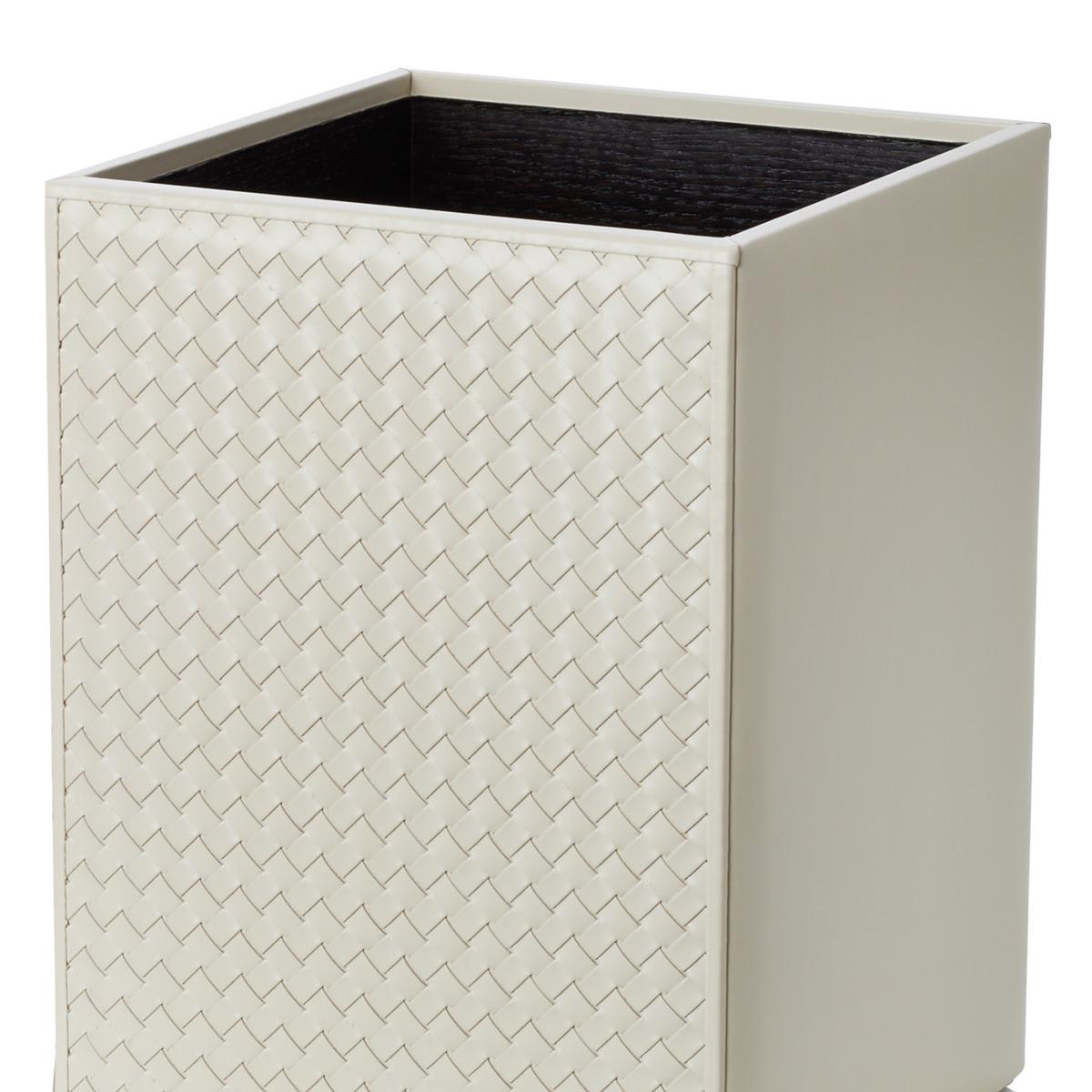 The elegant waste paper basket is encased in the finest calf leather, which is smooth on two sides and handwoven on the other two.