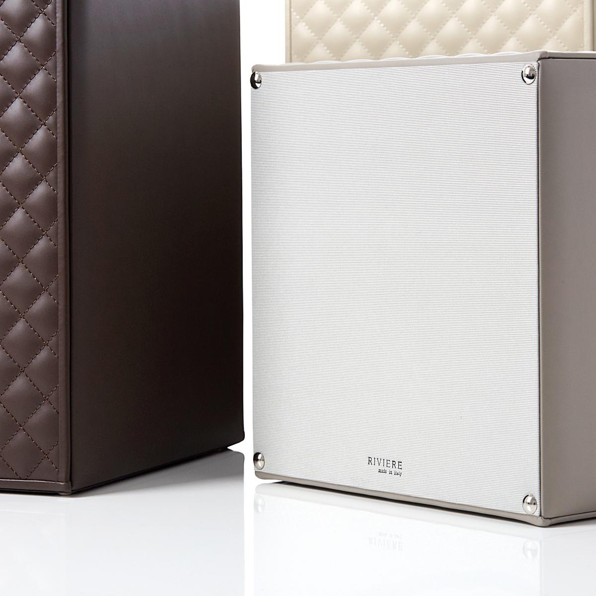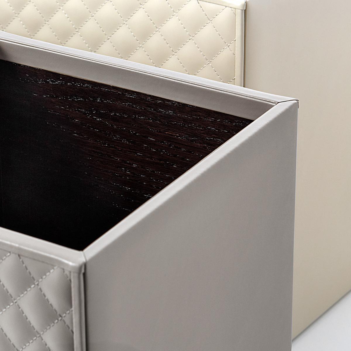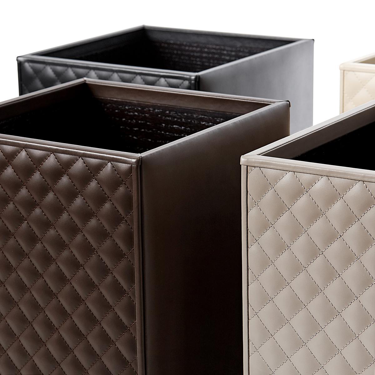 The "Vanity" waste paper baskets by Riviere are an enrichment for every interior. The elegant waste bins are made of the finest nappa leather and are purely handcrafted in Italy. Two of the outer sides are padded and quilted, the other two are made of smooth leather. The base of the bin is protected with a hard-wearing satin material. The interior of the paper bins is made of dark brown wood.