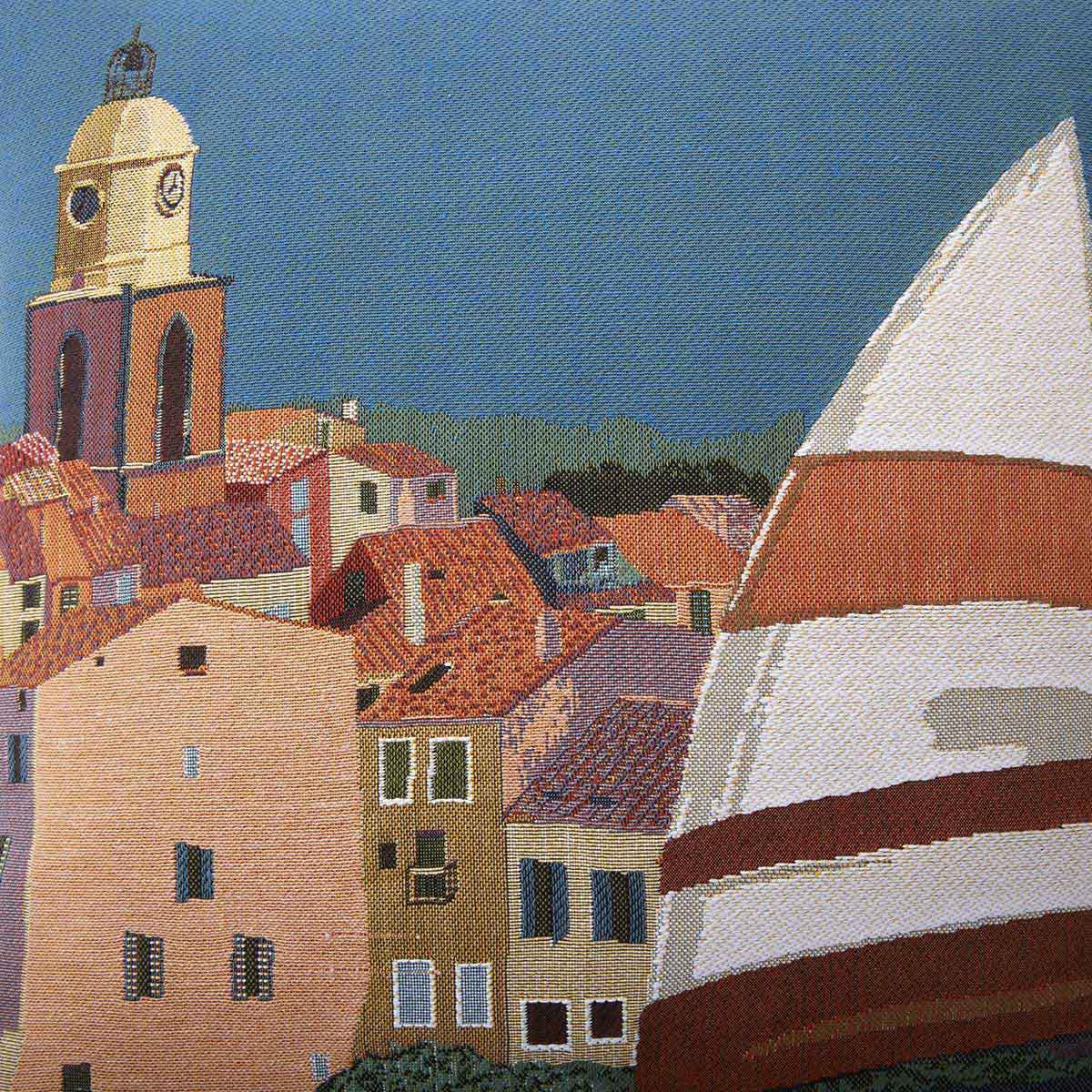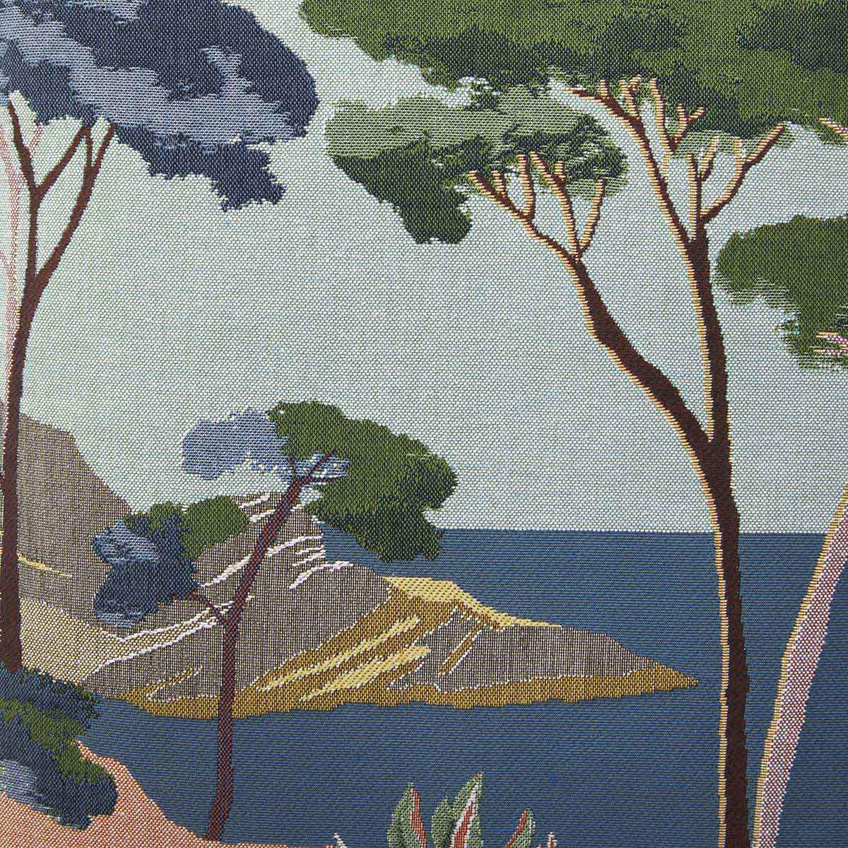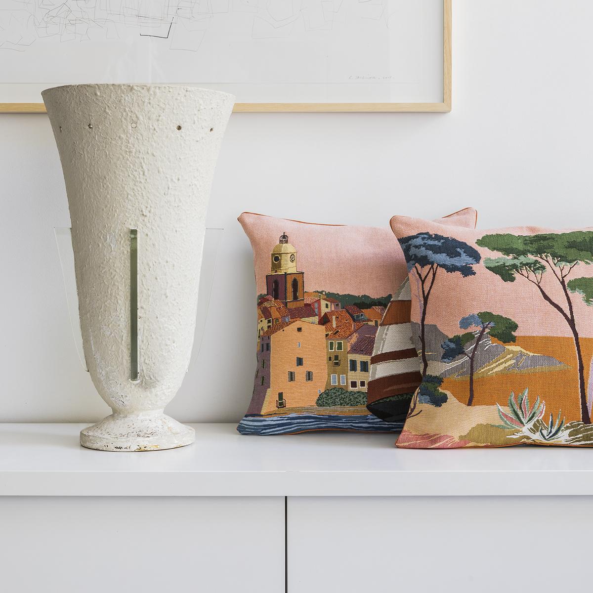 The sun, the sea and St. Tropez! The "Cigales" cushion by Iosis shows the legendary French town with its bell tower as seen from a sailing boat. The other version of the cushion shows further away on the coast a moment of bliss in a deserted bay in the shade of tall pine trees. The intricate motif is created by the technique of tapestry stitching with which the "Cigales" cushions are made in the textile manufactory Iosis.