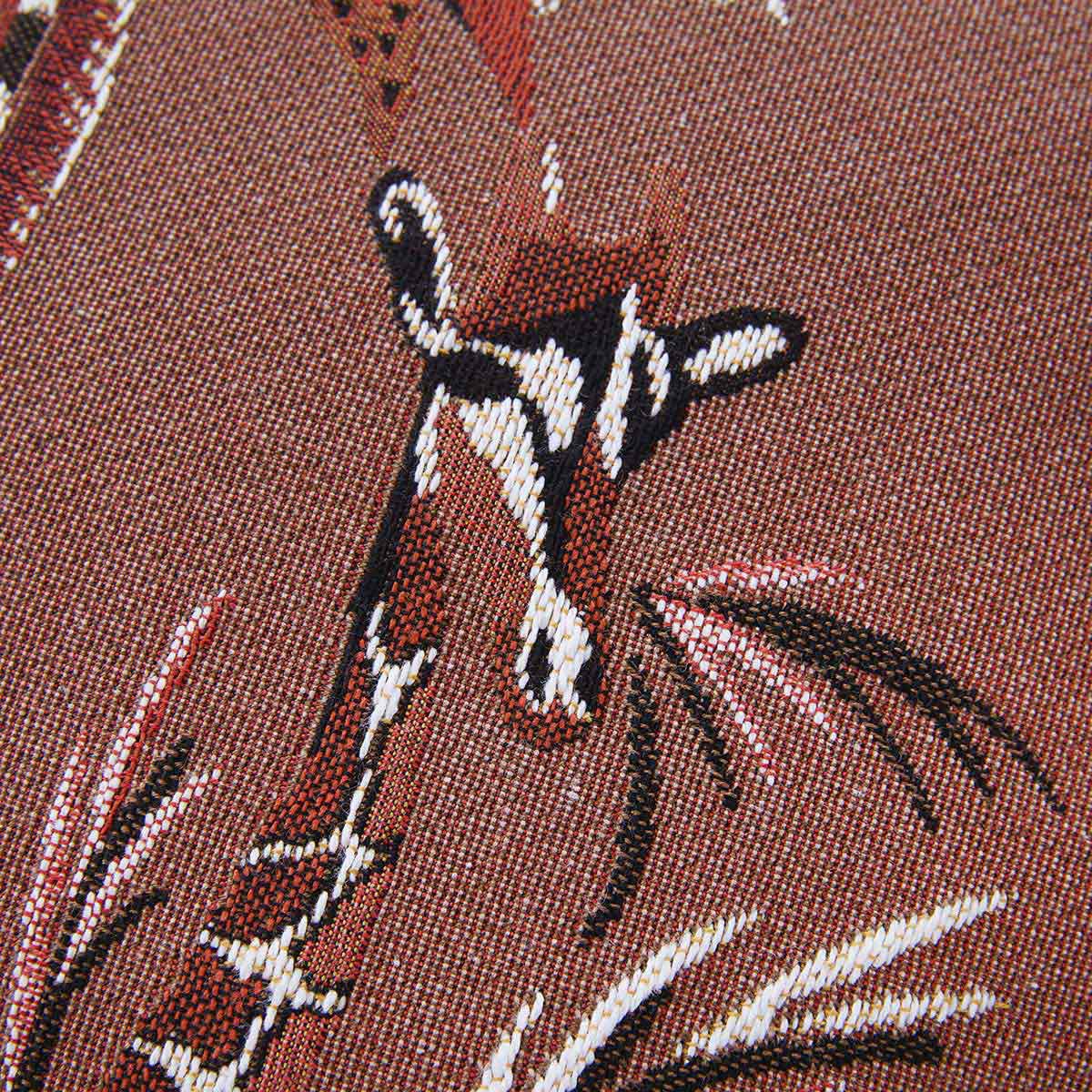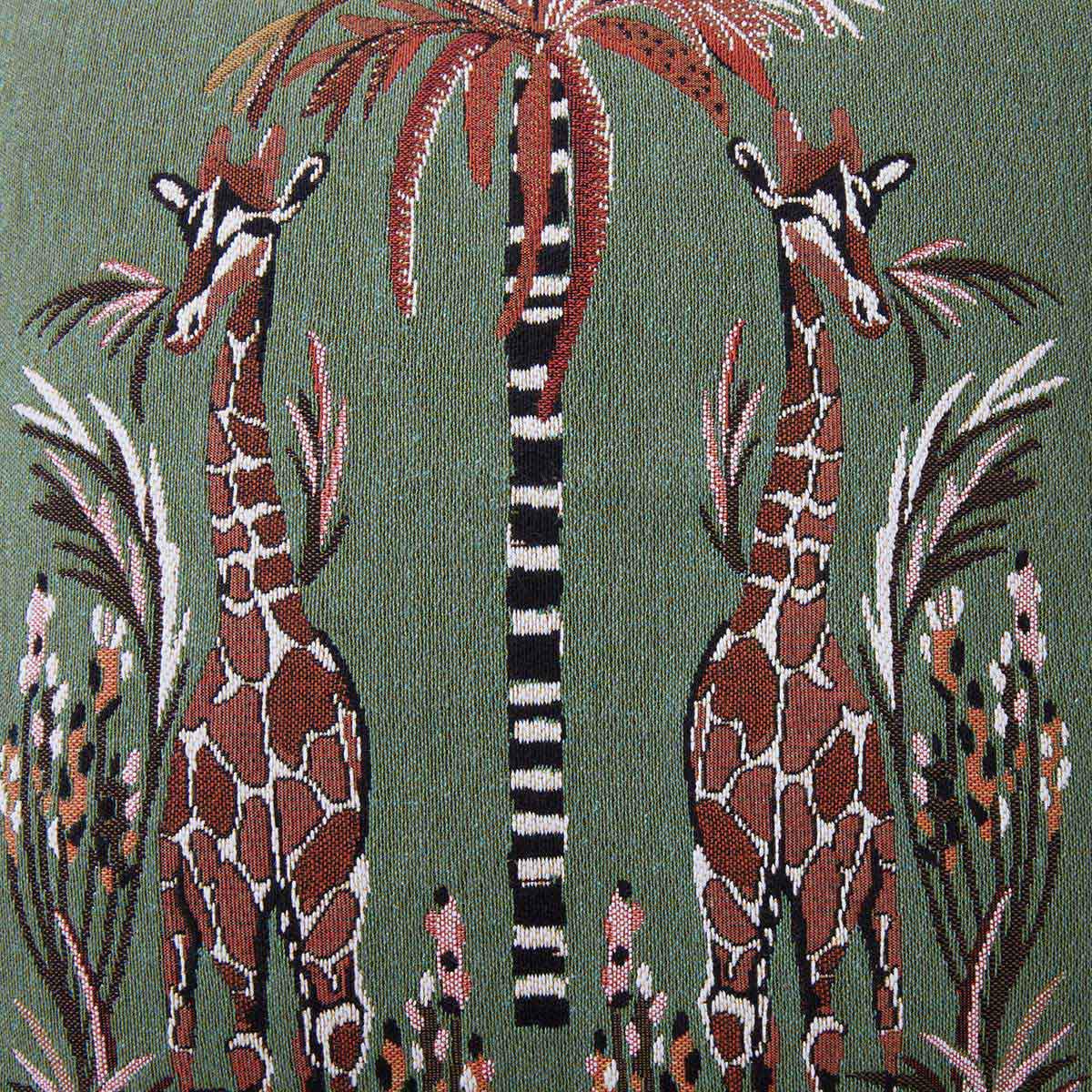 Nonchalantly, two sister giraffes seek shelter in the shade of a ruffled palm tree. With their long legs they walk through some colourful exotic plants. It almost seems as if the giraffes emerge three-dimensionally from their background and appear alive. The "Mesdemoiselles" cushions achieve this special effect through the rare technique of tapestry stitching with which they are made in the French textile manufactory Iosis.