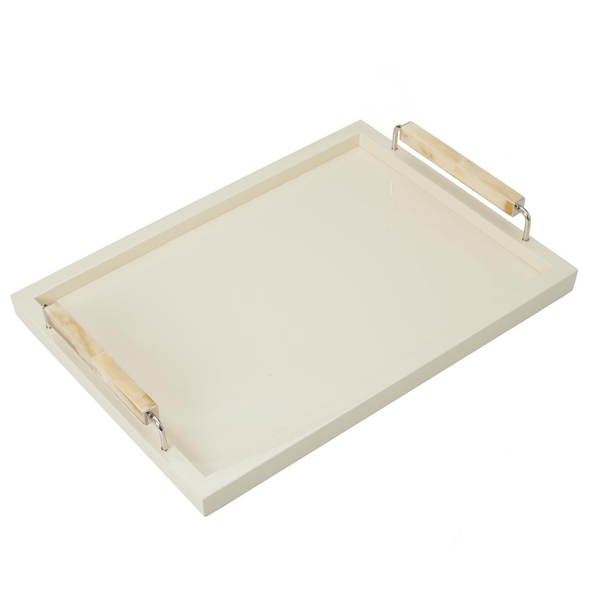 The "Isacco" trays by Arcahorn rely on a classic shape and a high gloss lacquer finish in ivory. In tune with this elegant appearance, the trays have handles made of pale buffalo horn. The bottom side is protected with ecru-coloured Alcantara.