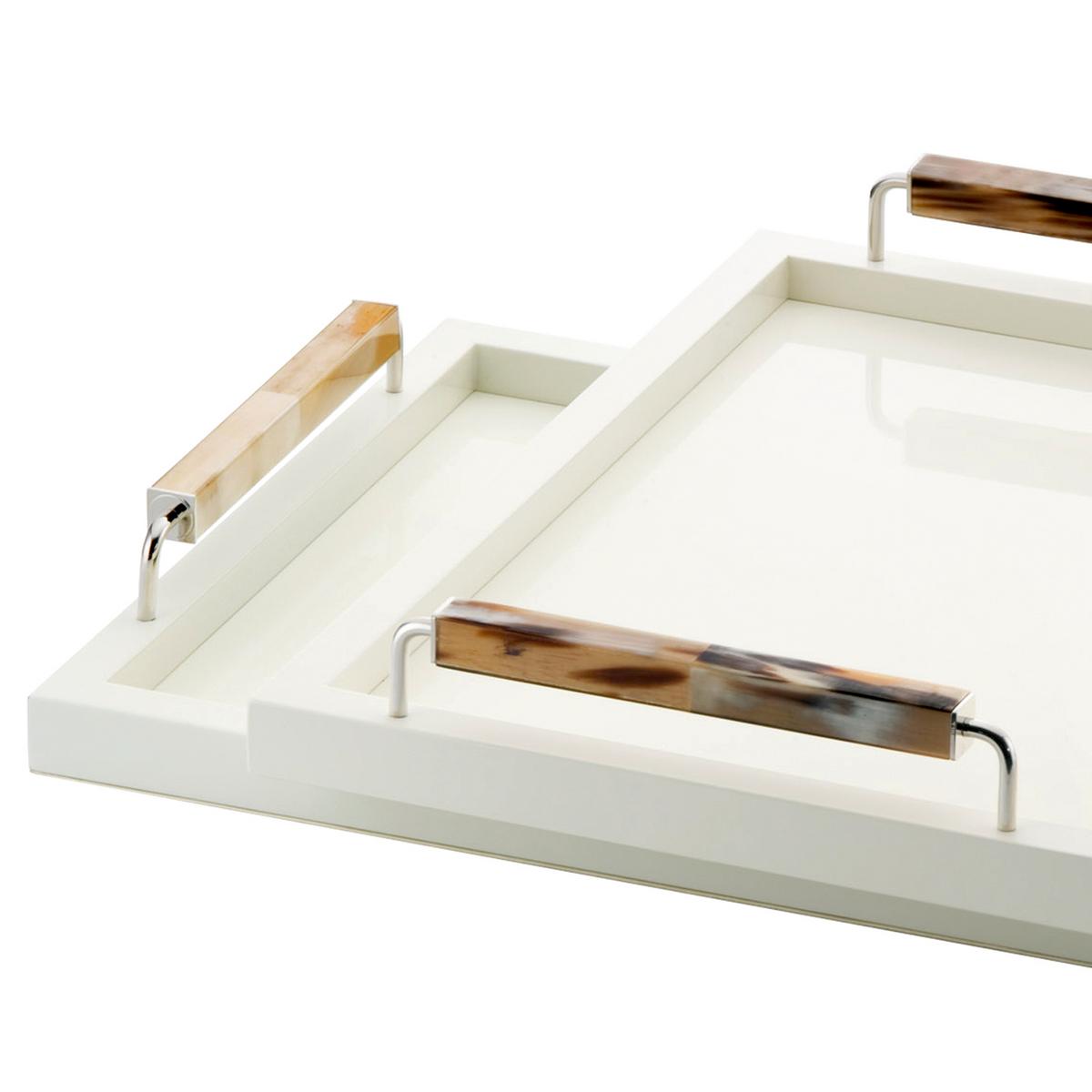 The "Isacco" trays by Arcahorn rely on a classic shape and a high gloss lacquer finish in ivory. In tune with this elegant appearance, the trays have handles made of pale buffalo horn. The bottom side is protected with ecru-coloured Alcantara.