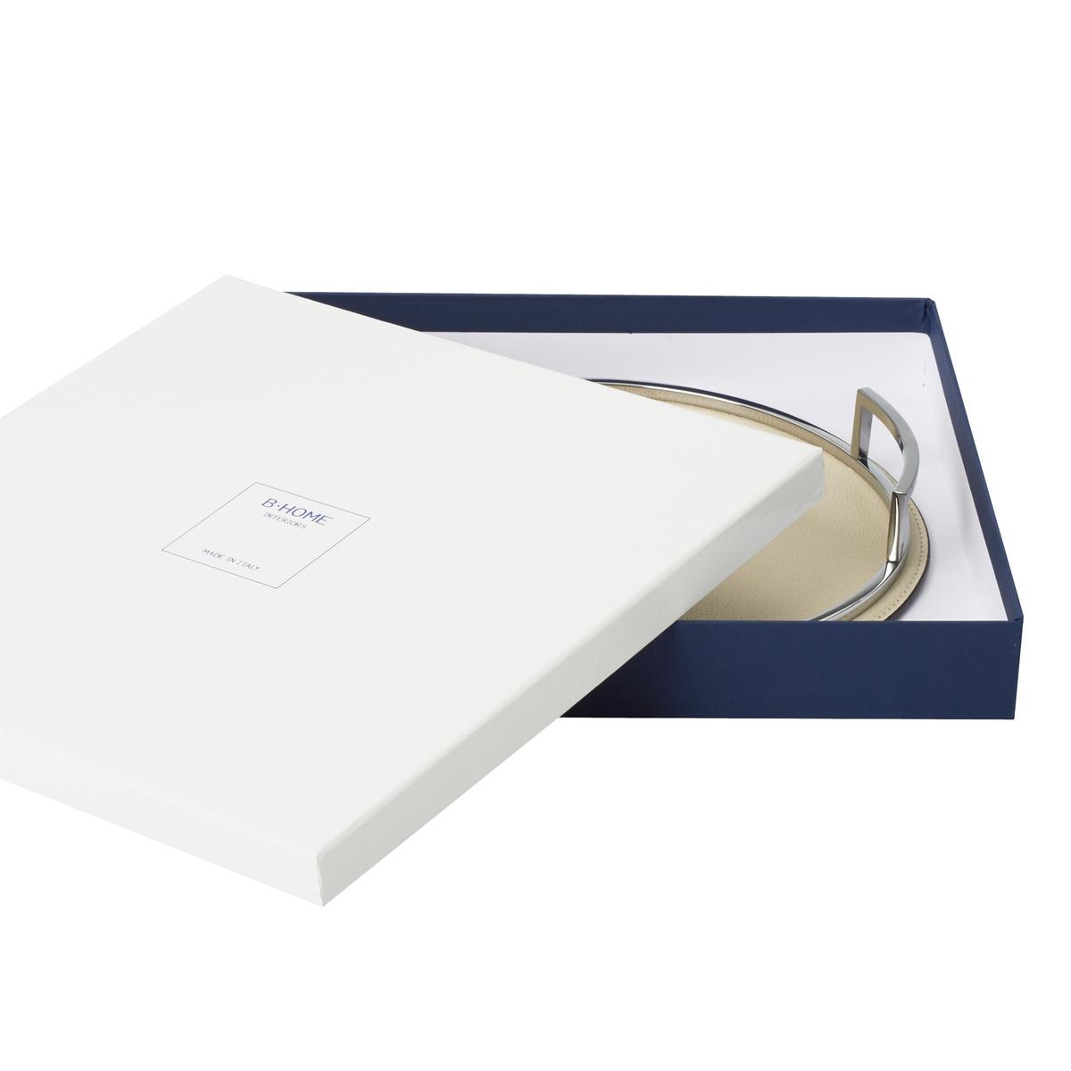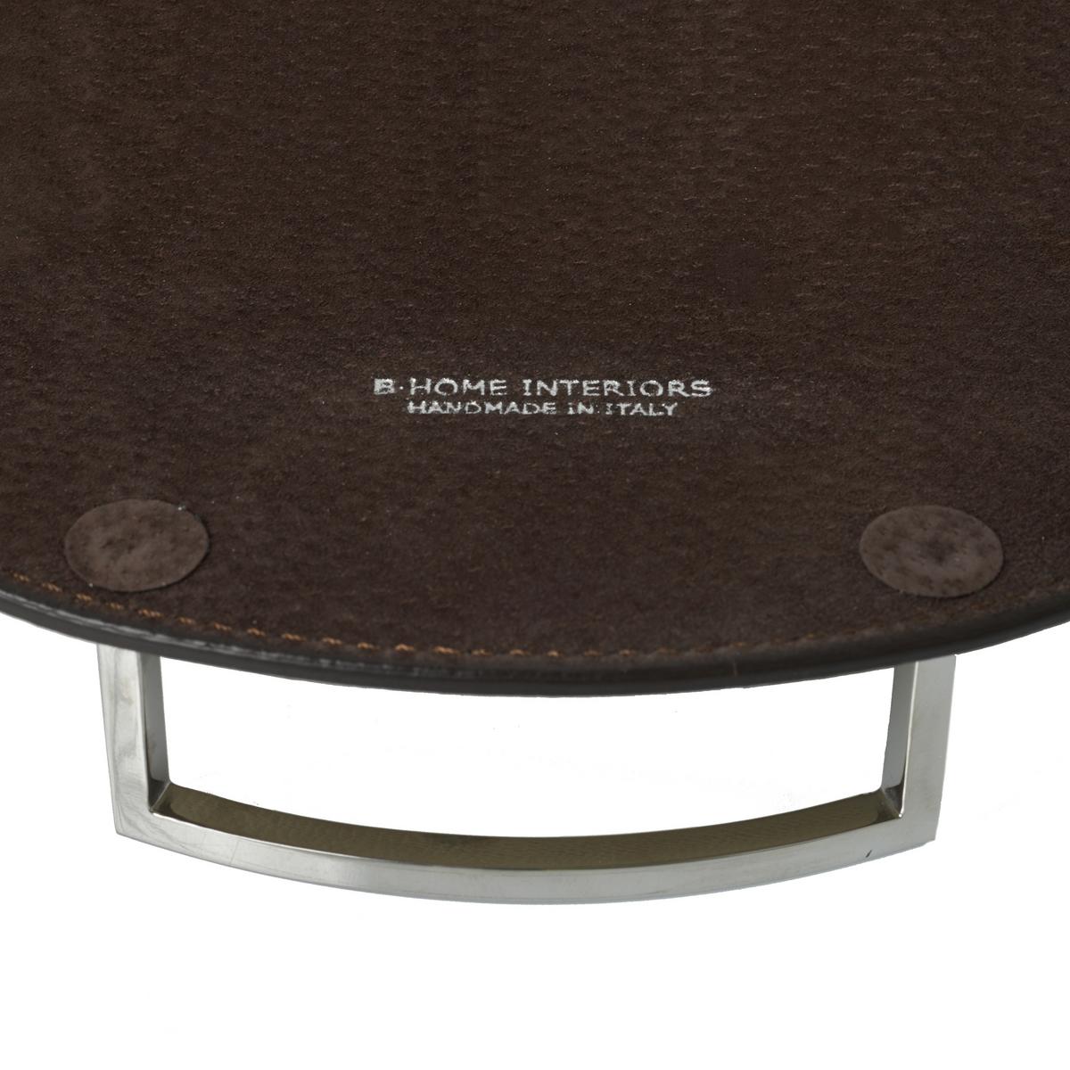 The round "Defile" trays are skilfully manufactured by hand in the Italian manufactory GioBagnara. It is easy to clean the leather surface of the tray with a soft cloth and mild soap. The base of dark-brown suede ensures that the tray does not slip on the surface.