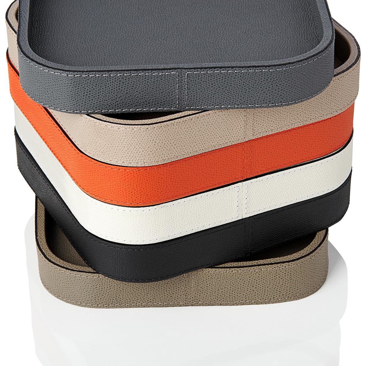 The calfskin of the square "Polo" tray is scratch and water proof and also low maintenance. You can clean the water-resistant leather surface with a soft cloth and mild soap. The tray base of dark brown suede ensures that it does not slip on the surface. The square "Polo" trays from GioBagnara are also available in further leather colours and sizes. Please just enquire with us.