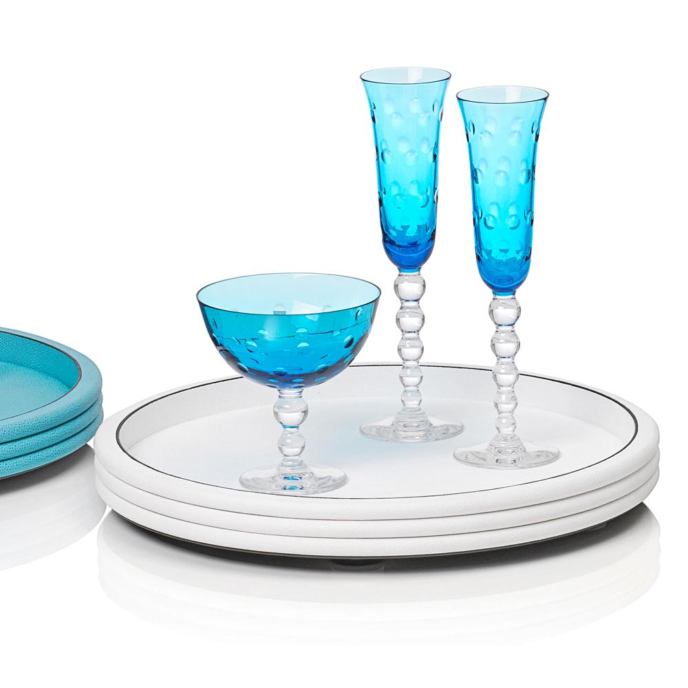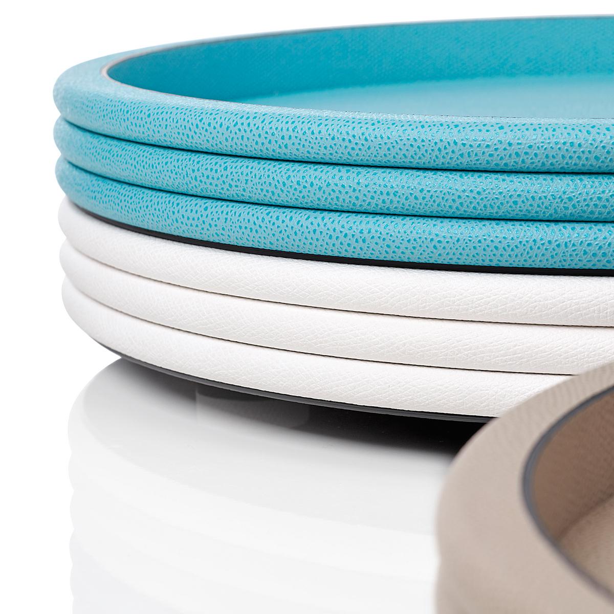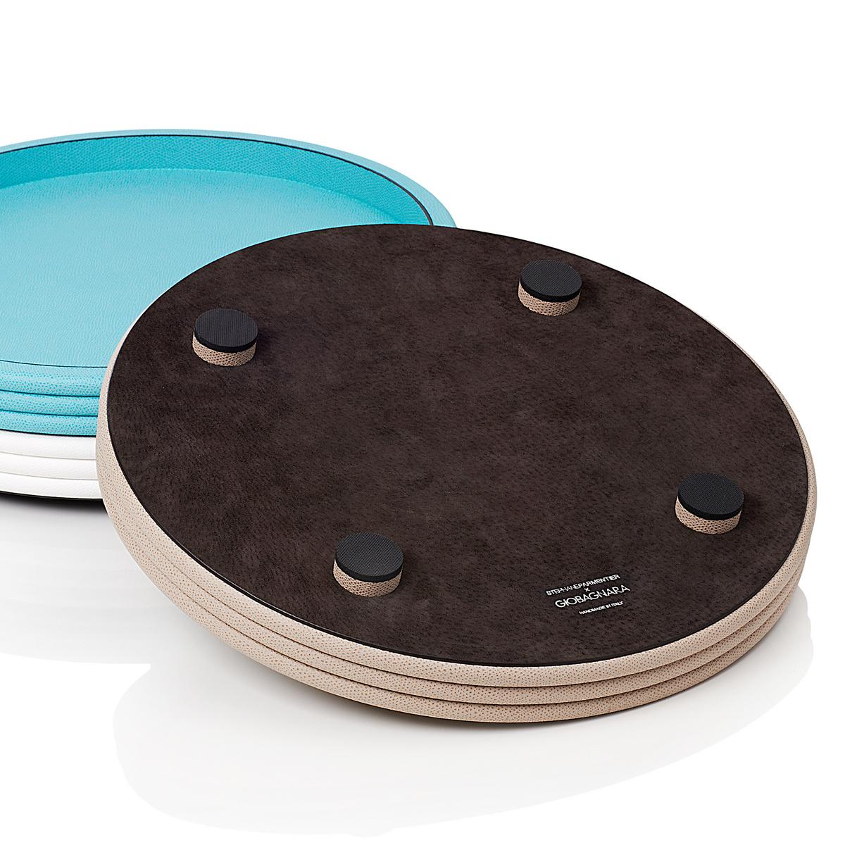 The "Scala" round trays are made of the finest, scratch and water resistant calfskin. The water-repellent leather surface defies stains of any kind and can be easily cleaned with a soft cloth and mild soap. Four little feet stand under the tray for a slightly elevated stand. It almost seems as if the trays are floating.