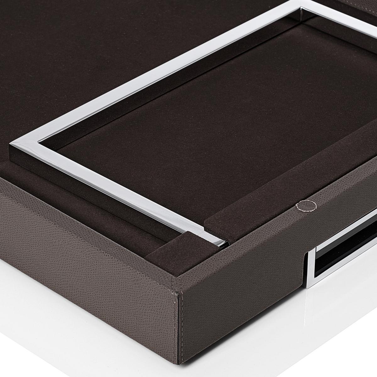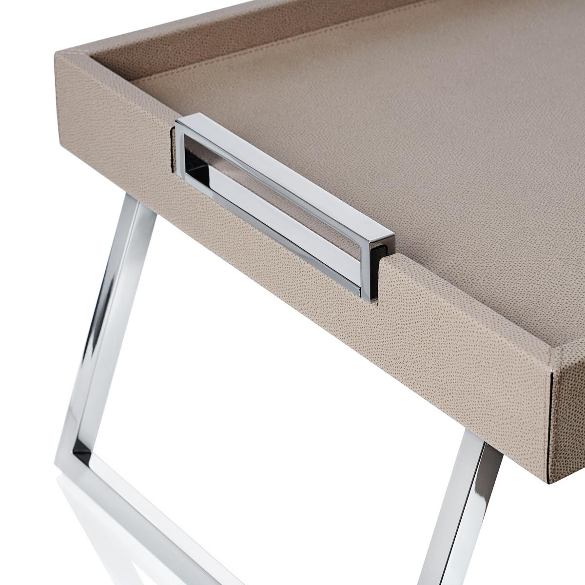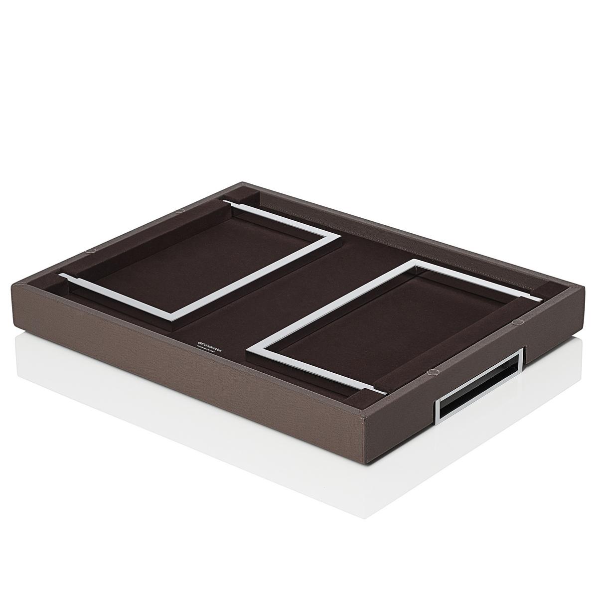 With the "Vic" bed trays from GioBagnara, there is nothing in the way of eating a full breakfast in bed. These trays are also very practical on the couch for example. The trays which are covered in leather from GioBagnara have chrome handles. The supports of the trays are also made of hard-wearing chrome and fold out or retract as needed. The base of the "Vic" bed trays is made of brown suede.