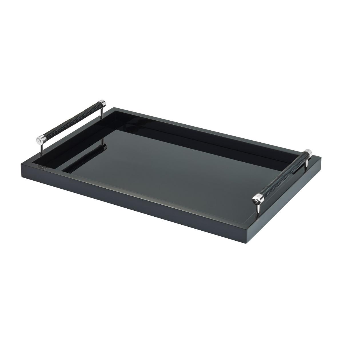 Lacquered tray with chrome/leather handles, black, large by Riviere