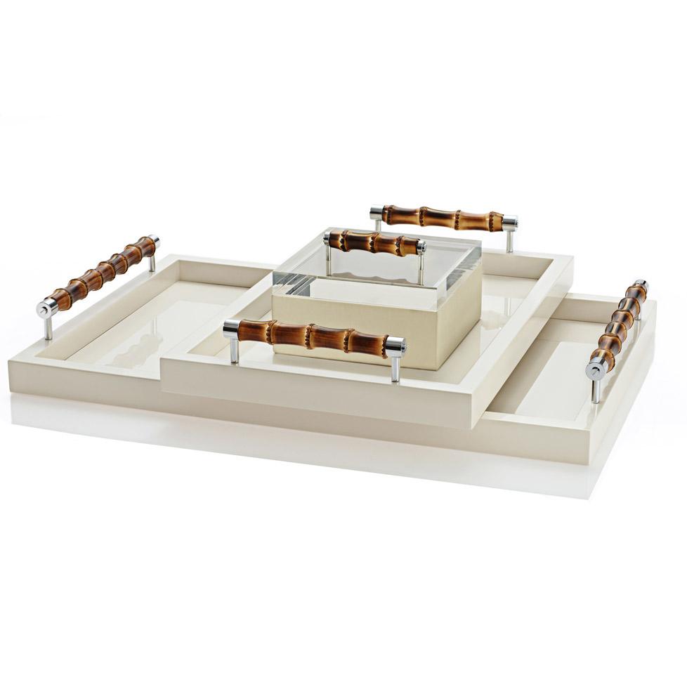 The lacquered trays in ivory with bamboo handles are crafted masterpiece of the Italian manufacturer Riviere.
