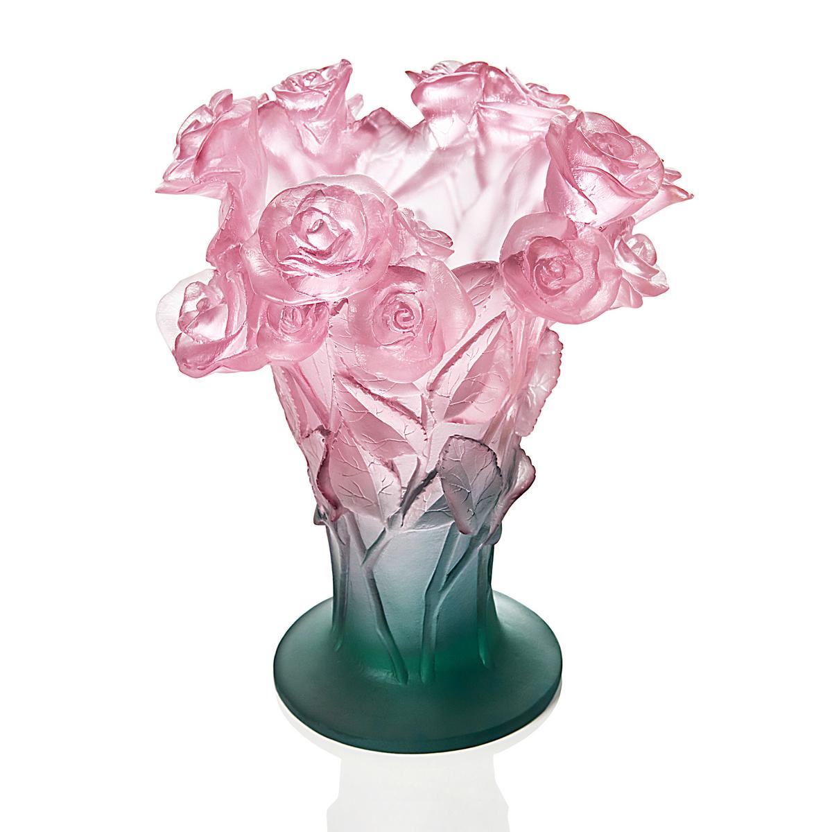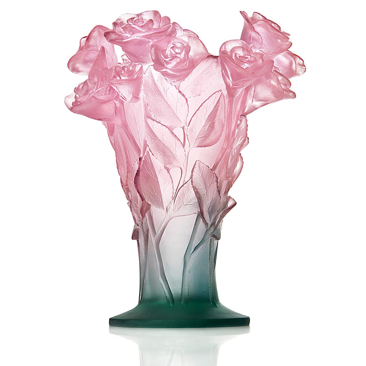 The inspiration for the "Roses" vase from Daum must have been a dewy summer morning in an English garden just after some young roses were cut and gathered lightly into a bouquet. Leaves and stems form the body of the vase, while a group of freshly opened roses crown the rim. Their colour is reminiscent of an Impressionist painting, with splashes of crisp green, delicate rosé and even shady violet.