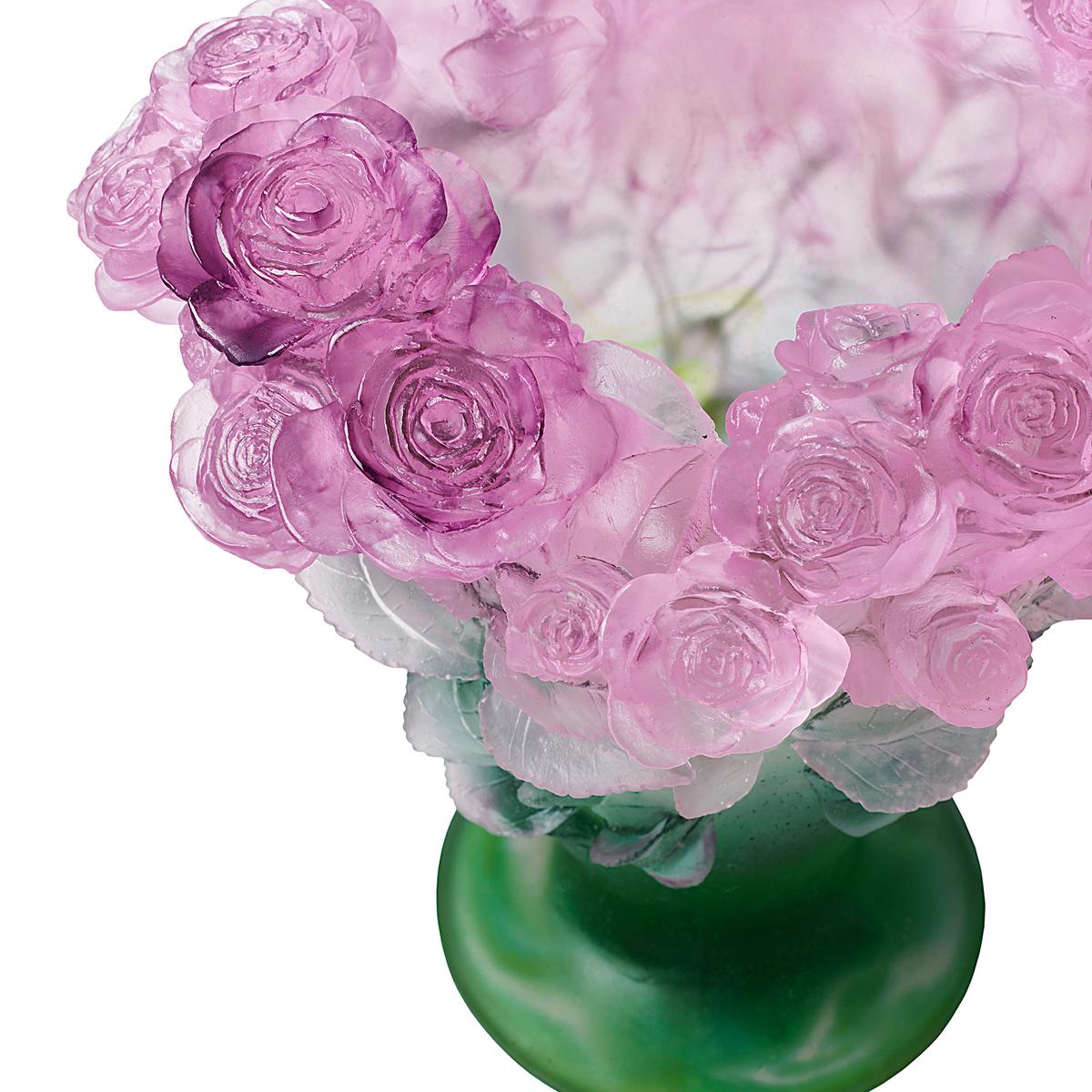 The inspiration for the "Roses" vase from Daum must have been a dewy summer morning in an English garden just after some young roses were cut and gathered lightly into a bouquet. Leaves and stems shape the body of the vase, while a group of freshly opened roses crown the rim. Their colour is reminiscent of an Impressionist painting.