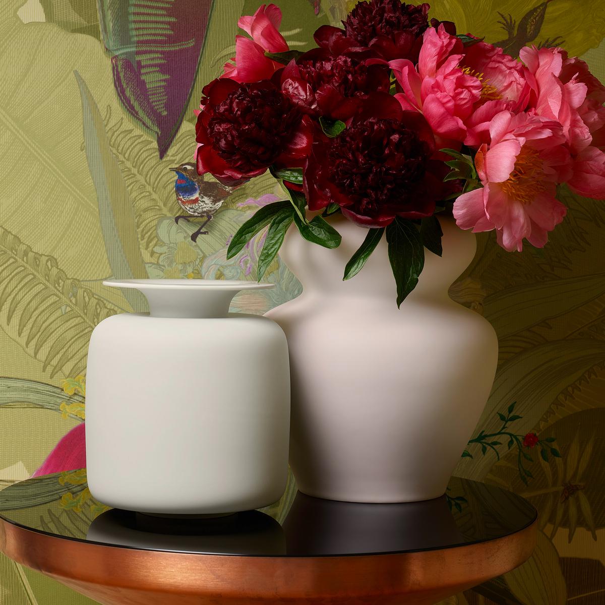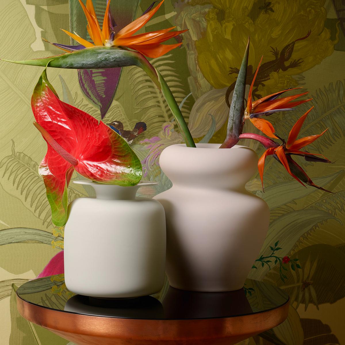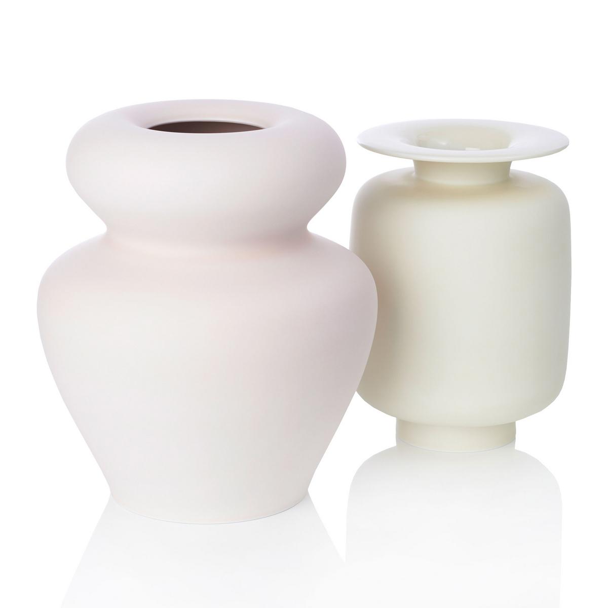 The "Fluen" collection from Fuerstenberg has some new additions: these two vases and a container. The fundamental principle is seen in the distinctive shape and the gently merging contours. The matt polished surface of the "Fluen" vases and container practically demands to be touched and exudes a soft, velvety feeling. This quiet design means that "Fluen" objects can be blended with many interior styles. The yellow vase is a little bit smaller than the pink one.