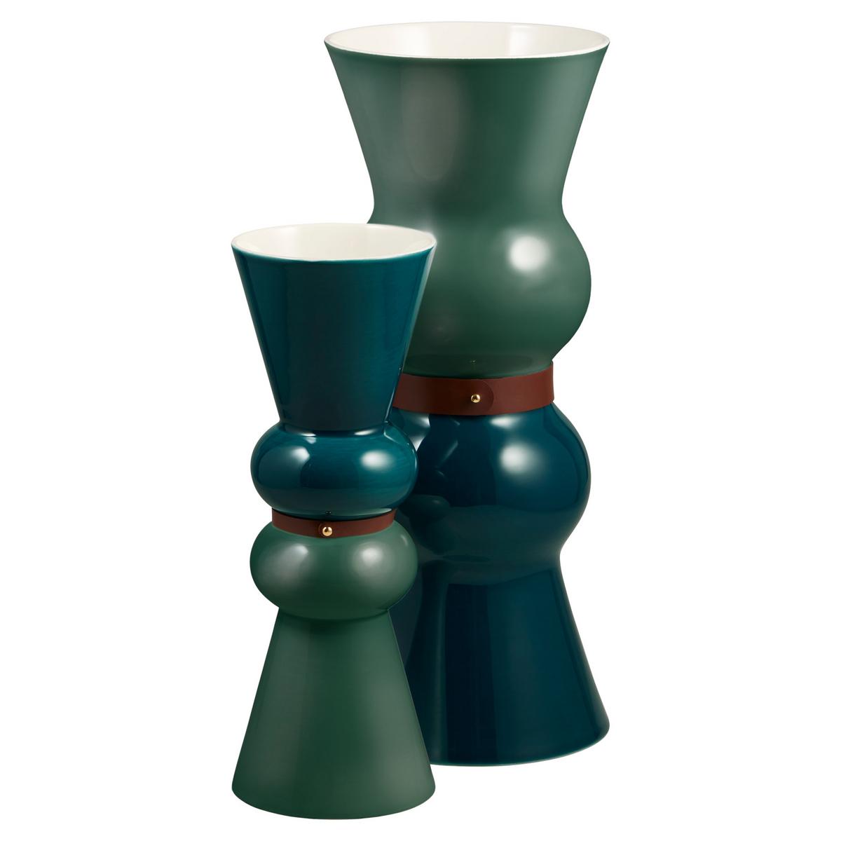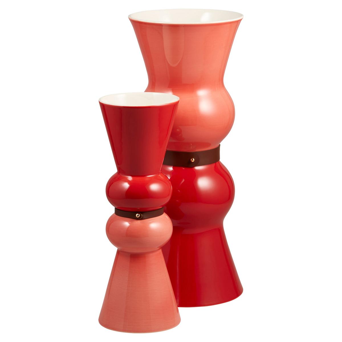 Designer Alnoor selected vases and vase shapes from existing vase ideas by Gien, reassembled them and gave them contemporary colours. A leather belt is the distinctive design highlight. Another special feature is a inner base that is at the same height as the leather belt. This means that the vases can be used from both sides.