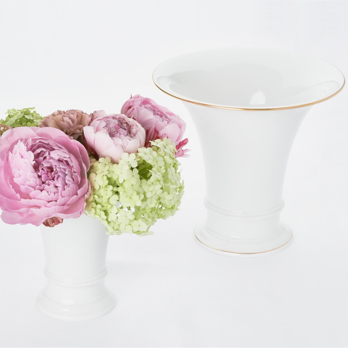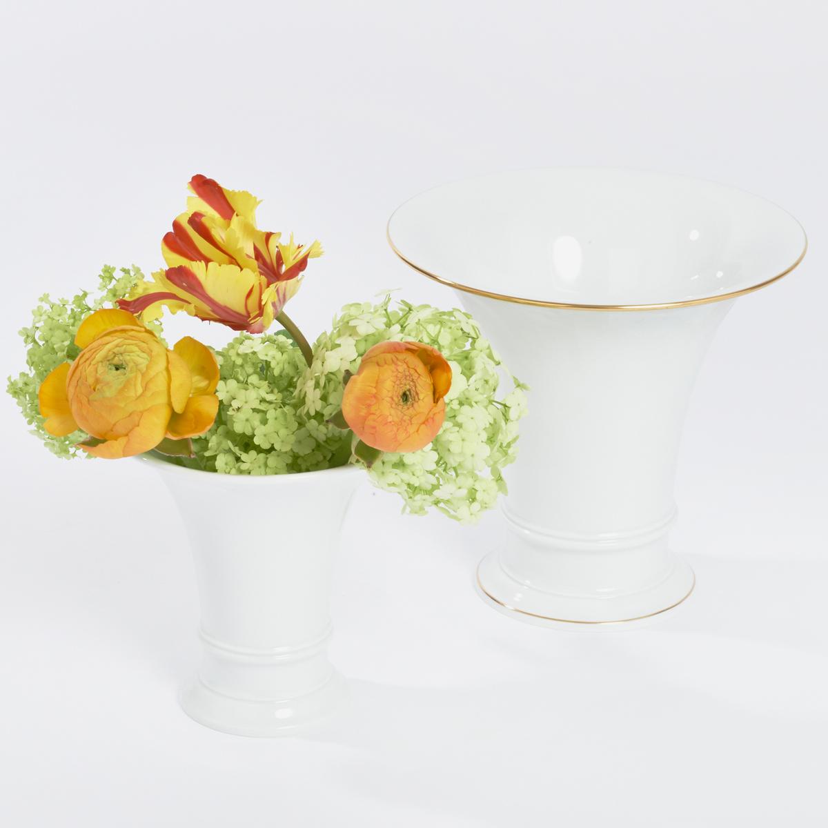 The "Trompete" vases are available in two sizes, either in pure white, or with a fine, gold edge.