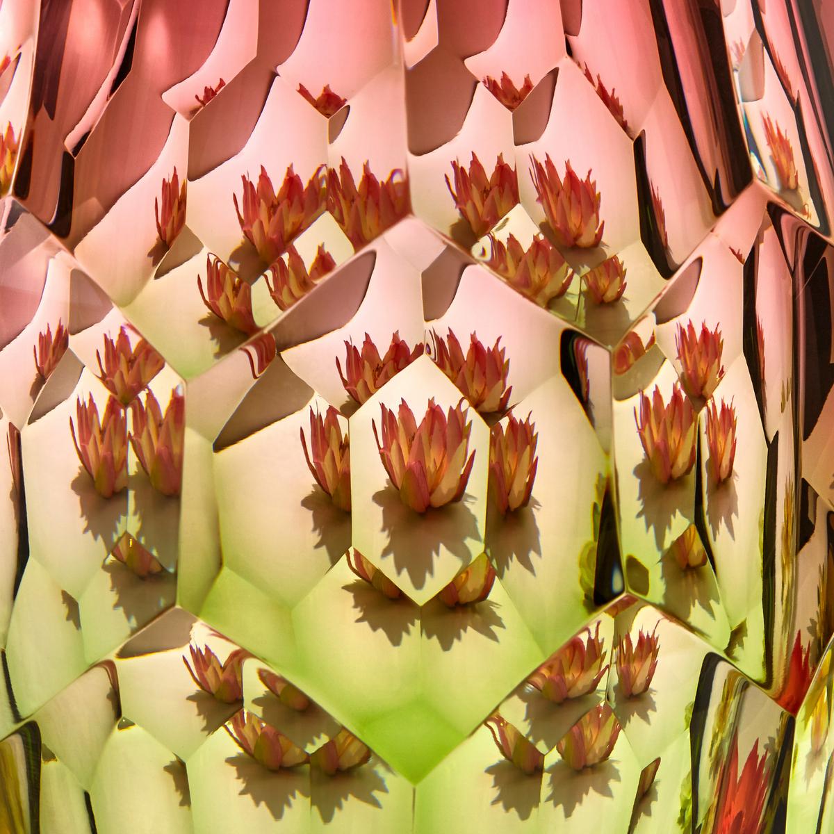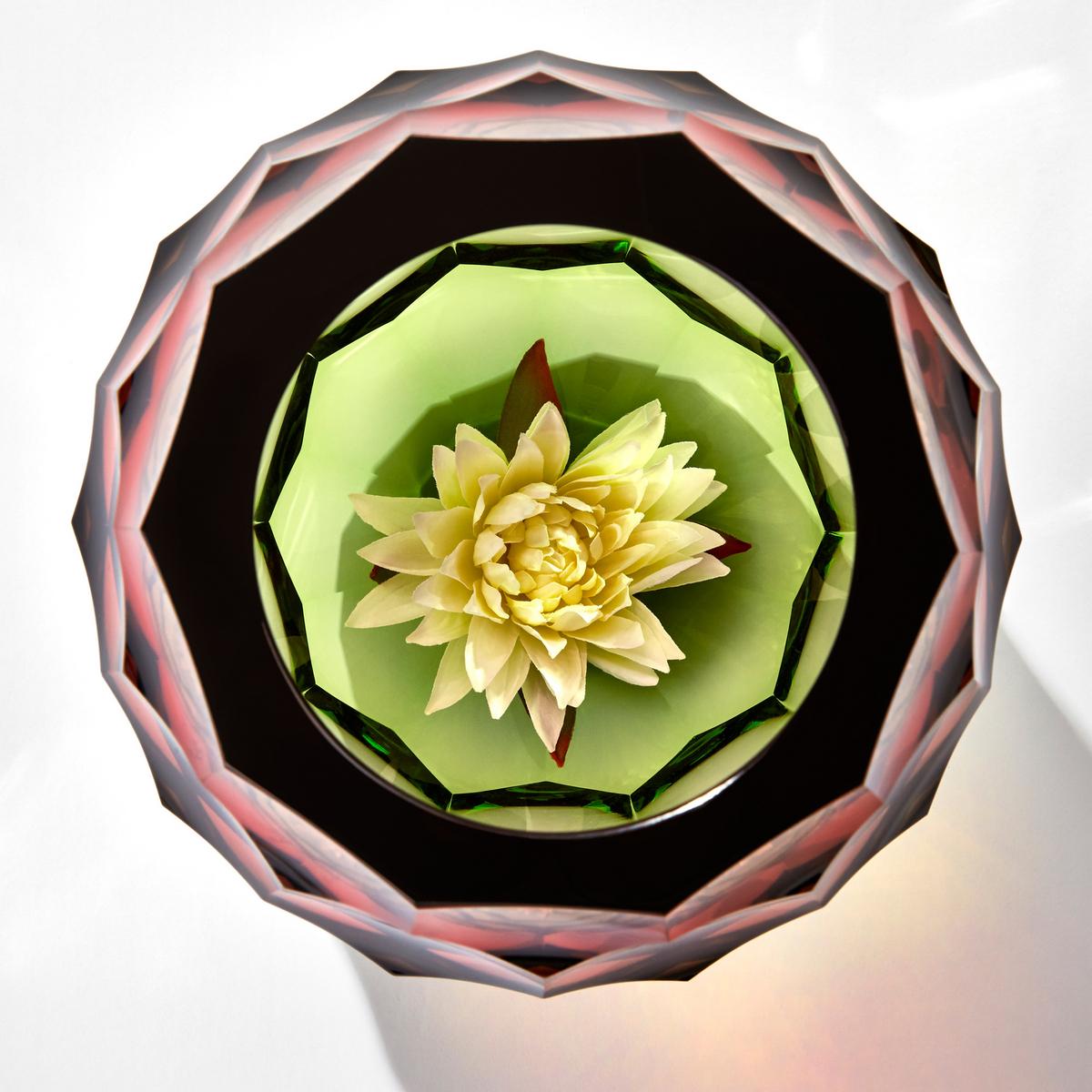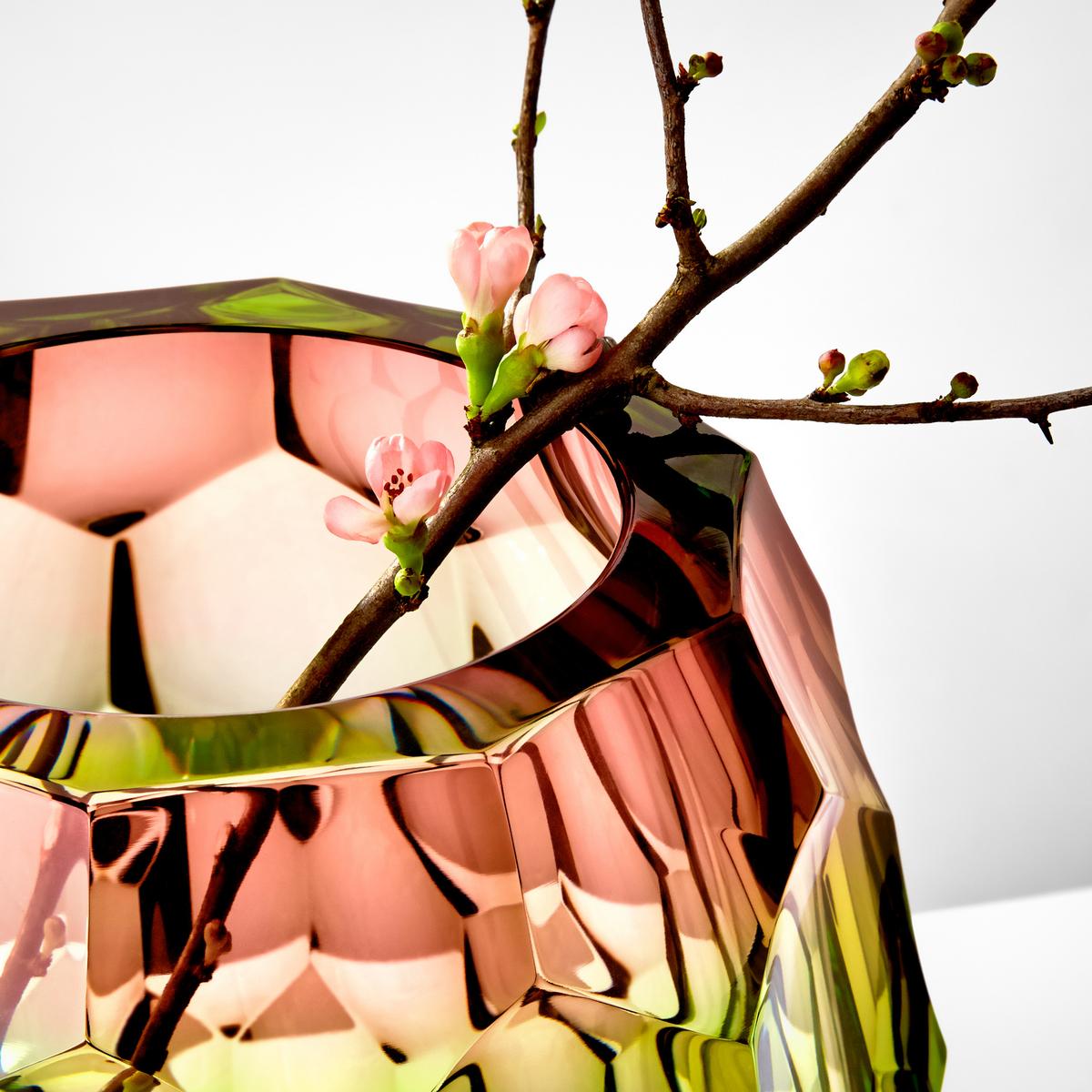 The refined hexagonal cut splinters the basic oval shape of this robust vase into a mosaic of many different views of the same reality. The sharp edges of the honeycomb cells are divided by strips, and then they immediately rejoin into a new story. The singular harmony of flashed tones of ocean green and rose is unbelievably beautiful. Moser’s unmistakable colour palette consists of subtle, almost intangible colours that change in intensity when the objects are turned and rotated.