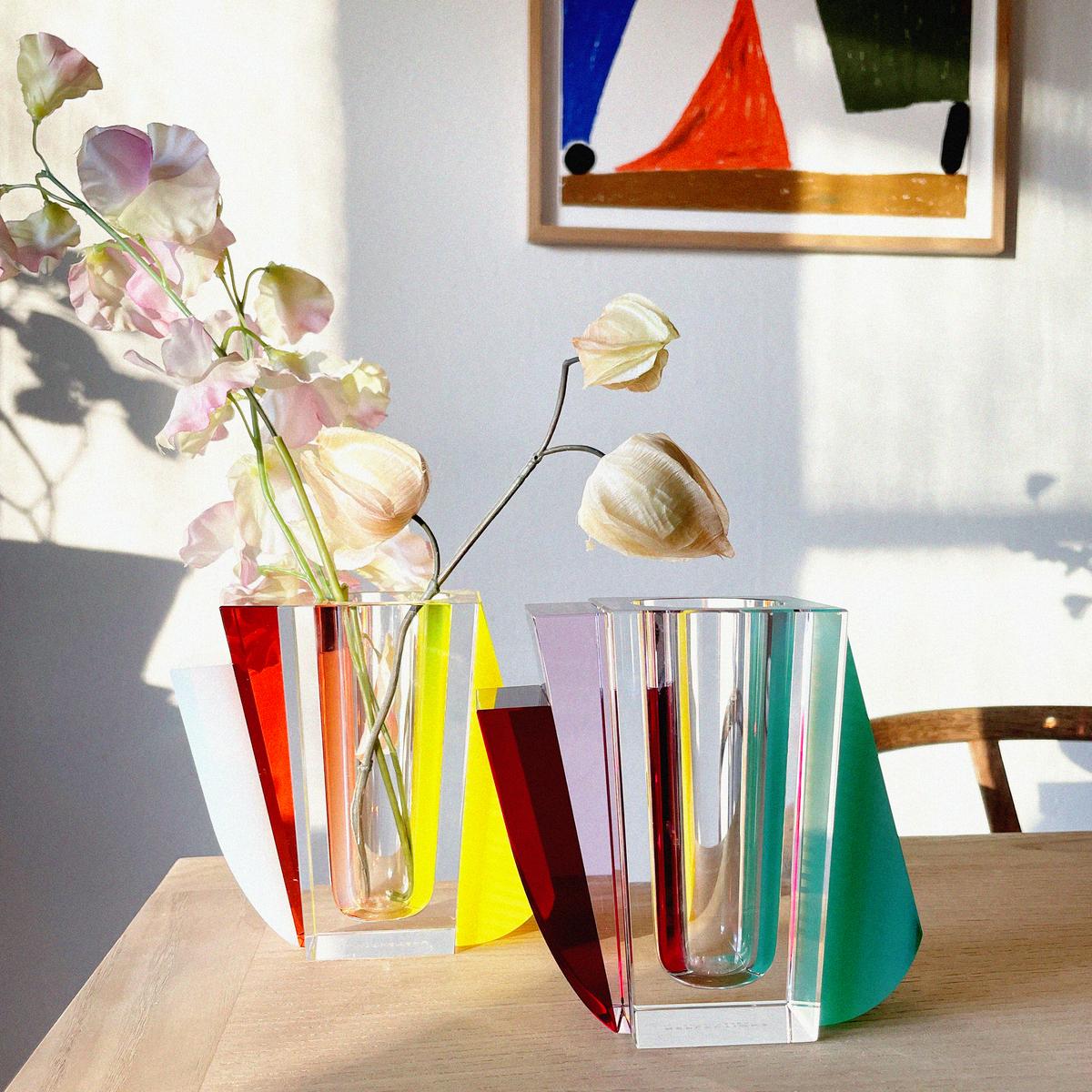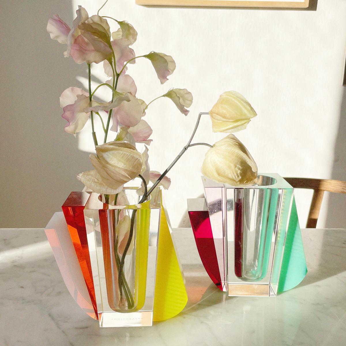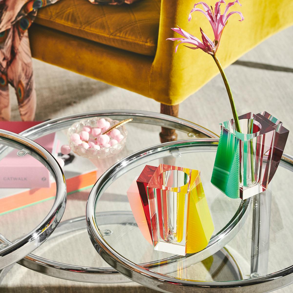 Crystal glass décor by Reflections Copenhagen challenge design traditions with unique colours and shapes. The "Raleigh" vase combines green, red and yellow elements that are fused together perfectly. The colours reflect each other, creating new hues, highlights and shadows. The vase offers new effects and details to discover from all angles.