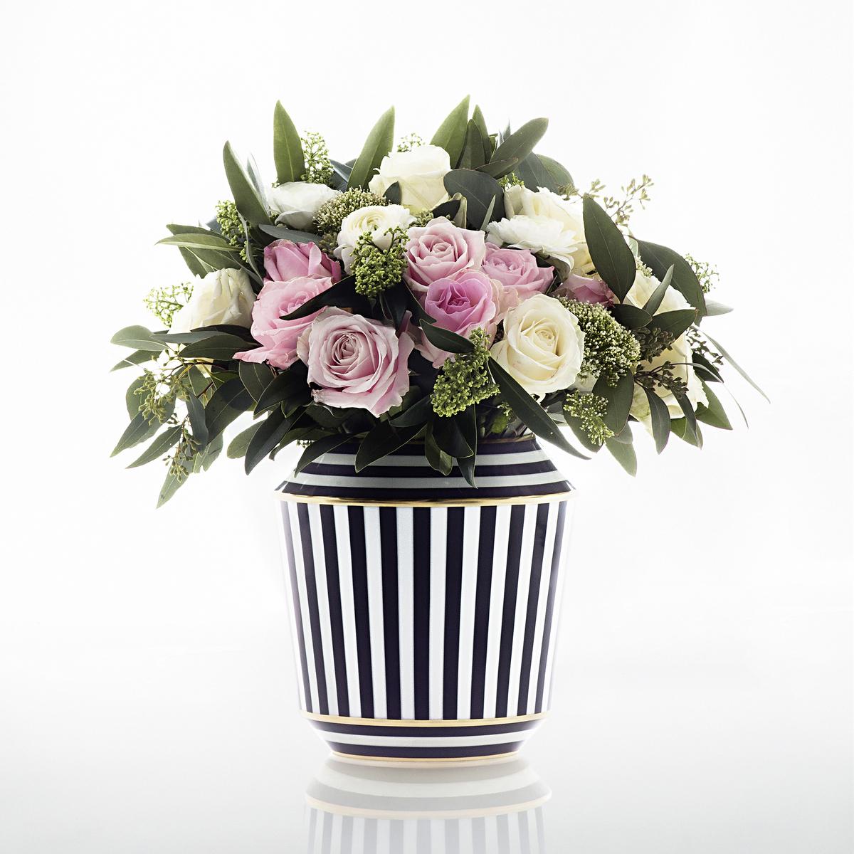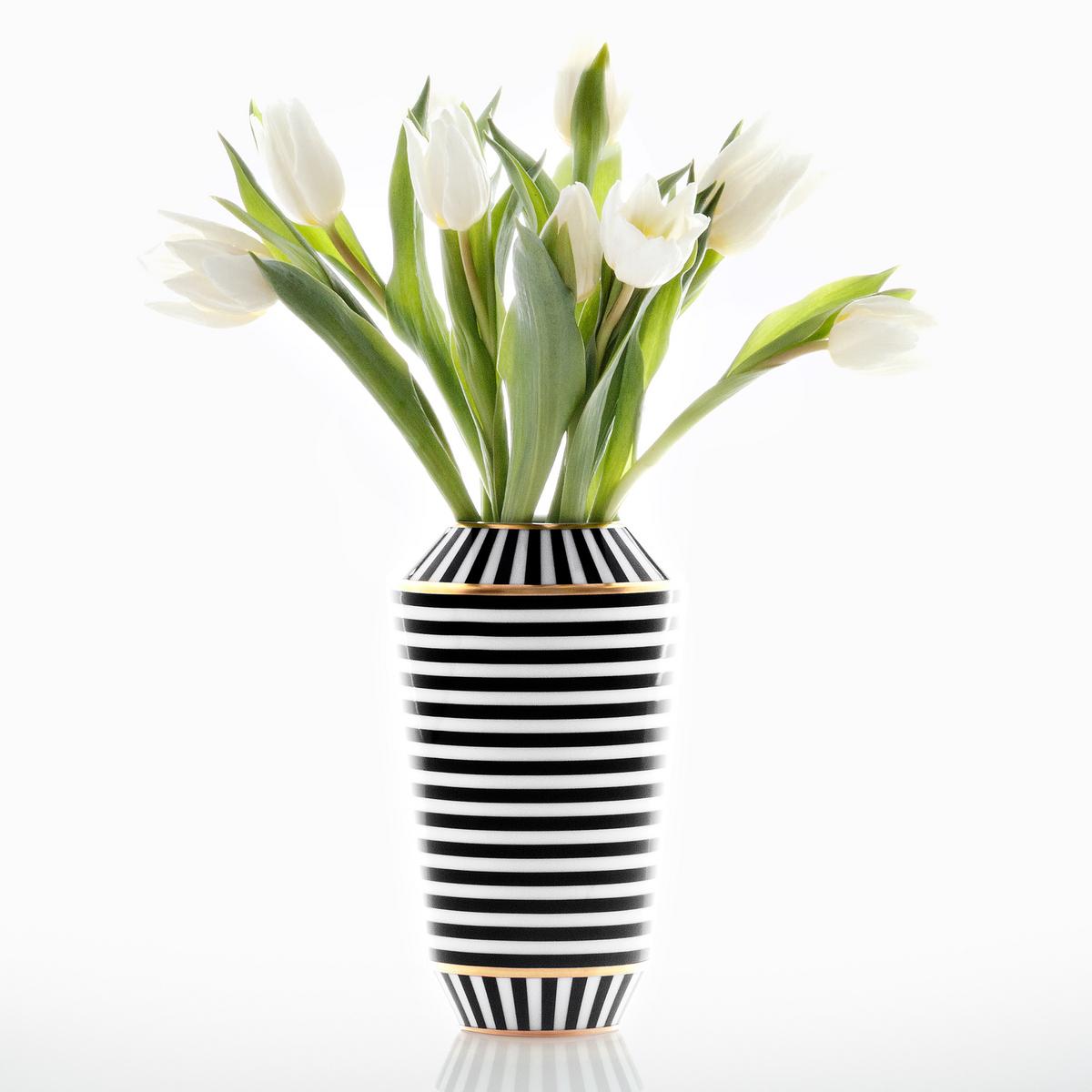 One thing that makes the "Ca d'Oro" vases by Sieger by Fürstenberg so special is their tapering conical form. Available in three sizes, the porcelain vases can therefore showcase both smaller and more lavish floral bouquets. The black-and-white "Ca d’Oro" decor brings together both vertical and horizontal stripes – refined with 24-carat burnished gold. The vases are handcrafted in Germany by the porcelain manufacturer Fuerstenberg.