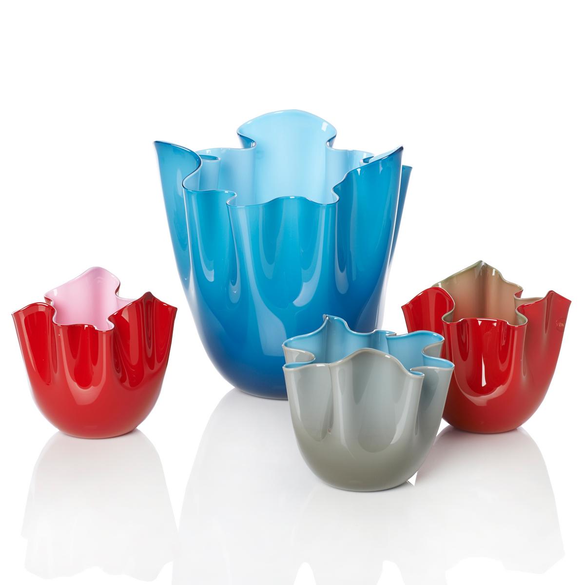 The “Fazzoletti Bicolore” vases are one of the classic designs in the Venini collection. The colourful vases are exhibited in many art museums around the entire world, including for example in the Museum of Modern Art in New York. The “Fazzoletti Bicolore” vases are available in wonderful colours. Depending on the angle of the light, the Murano glass objects show ever new colour variations.