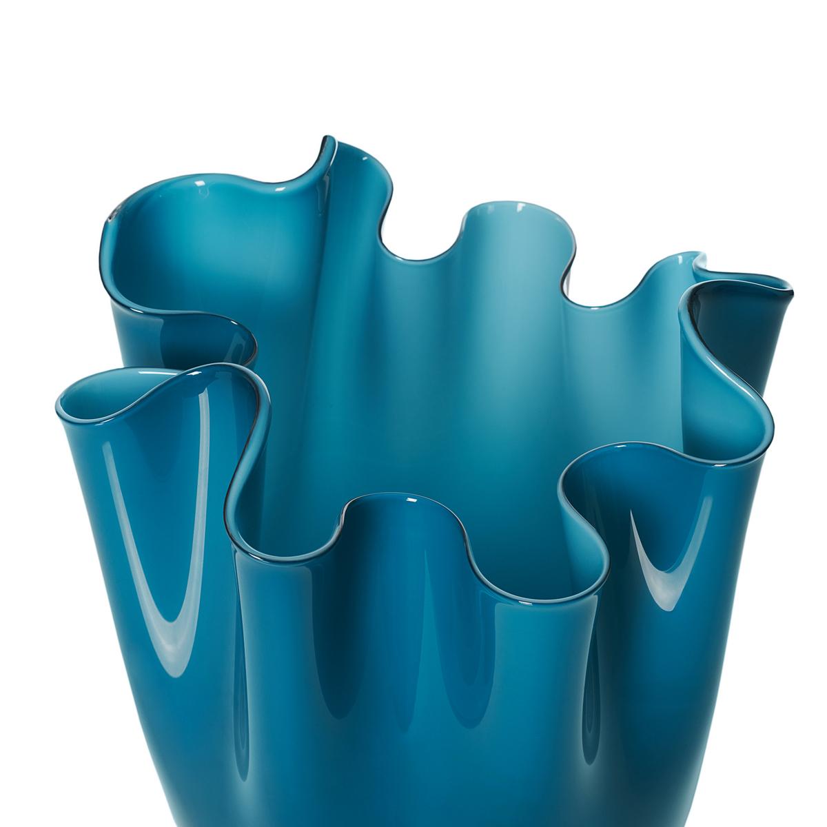 The production of a vase "Fazzoletti Opalino" in dark blue requires from the Venini glassblowers particularly great skill and sensitivity. When the glass master has blown a ball of molten glass, he cuts it open. With a skilled swinging motion, the craftsman forms the vases into a shape that resembles a bunched handkerchief. This also explains the name: "Fazzoletti" means handkerchief in Italian. Each vase from Venini is handmade and thus quite unique.