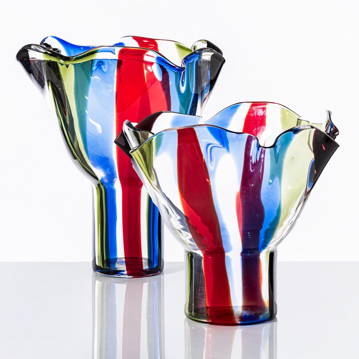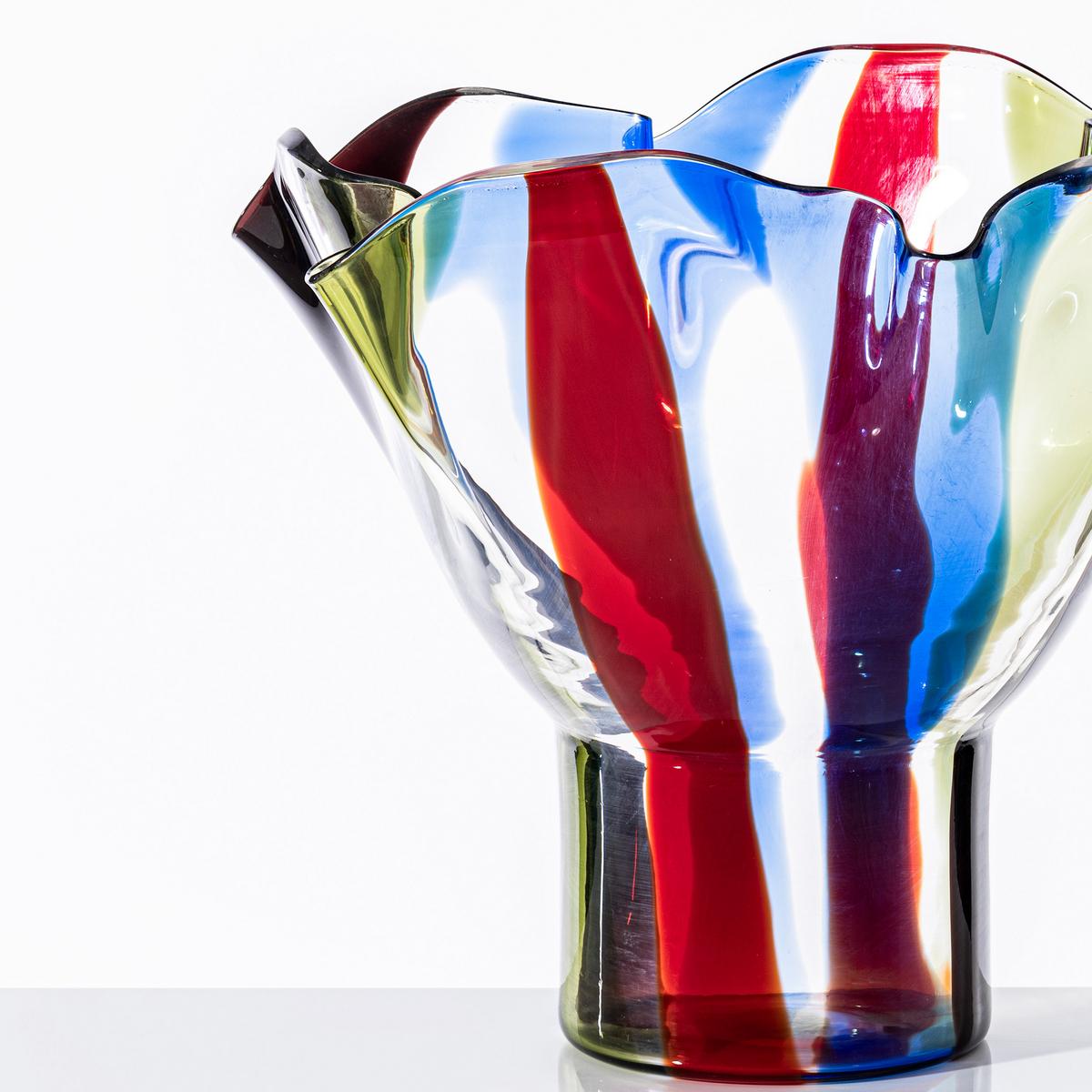 During the production of the "Kukinto" vases glass strips of varying colours are fused together. The video from Venini impressively shows how much expert work goes into the production of a 5-6 kg "Kukinto" vase. The 40-47 cm high vases make striking ornaments.