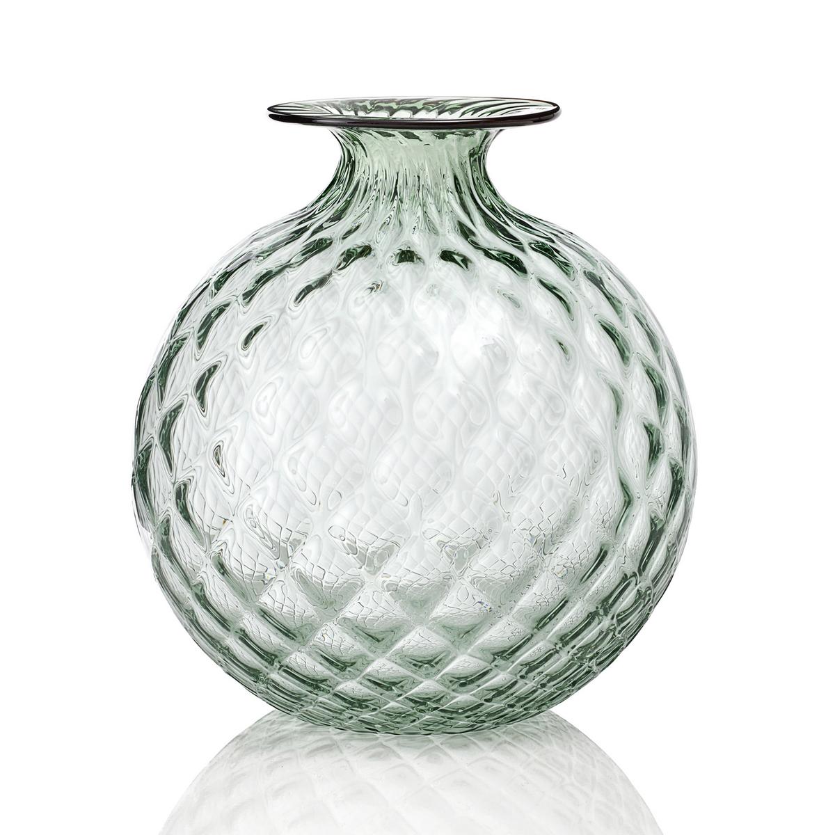 Venini’s "Monofiori Balloton" vases in turquoise are an absolute classic from Venini. A distinctive feature of the wide-bellied Murano glass vase is the red line around its neck. The coloured glass ring is a result of the so-called "Balloton" technique. In order to produce it, a glass thread is applied when hot on the top of the "Monofiori Balloton" Venini vase. This forms a pretty contrast to the round-shaped body of the Murano glass vase.
