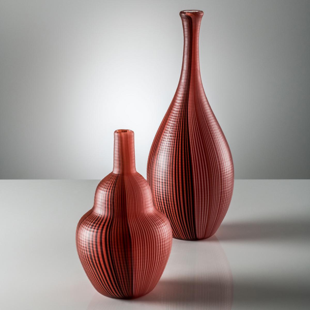 The decorative "Tessuti Battuti" vases are made using a particularly intricate "Cane" technique. The fine lines of the vase are created by fusing together melted stripes of glass. The glass rods can be in one colour or multi-coloured. The glass master lays the colour glass rods on a metal sheet. These glass rods are then heated and fused together. Subsequently, the melted glass can be processed and shaped into vases. When the glass object has been cooled, it is further worked using the Battuto technique. The translation of the Italian word "battuto" is "beaten" or "wrought" and means that the glass surface is cut. That is what gives the vases their characteristic cut surface.