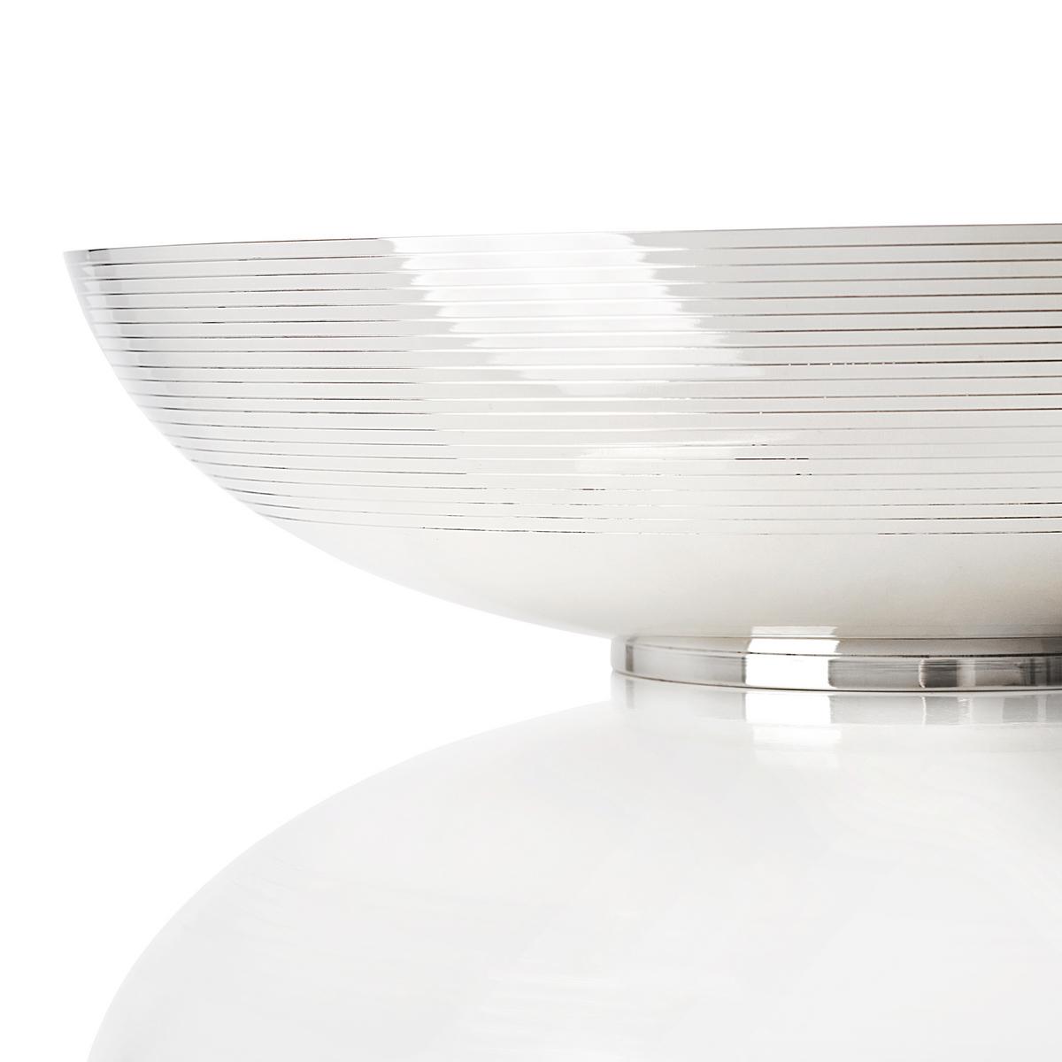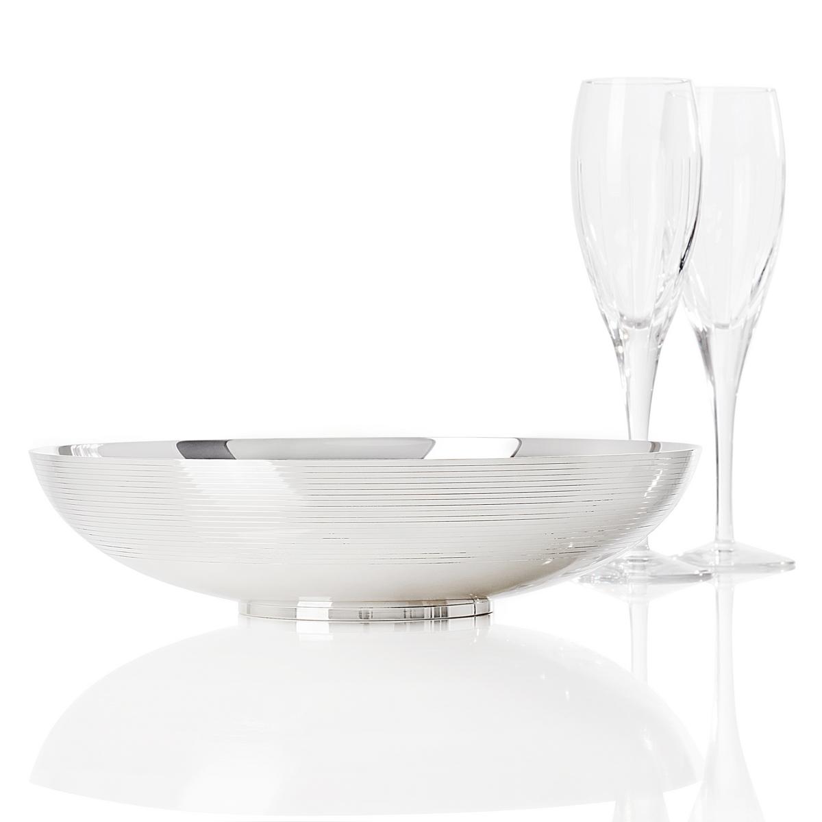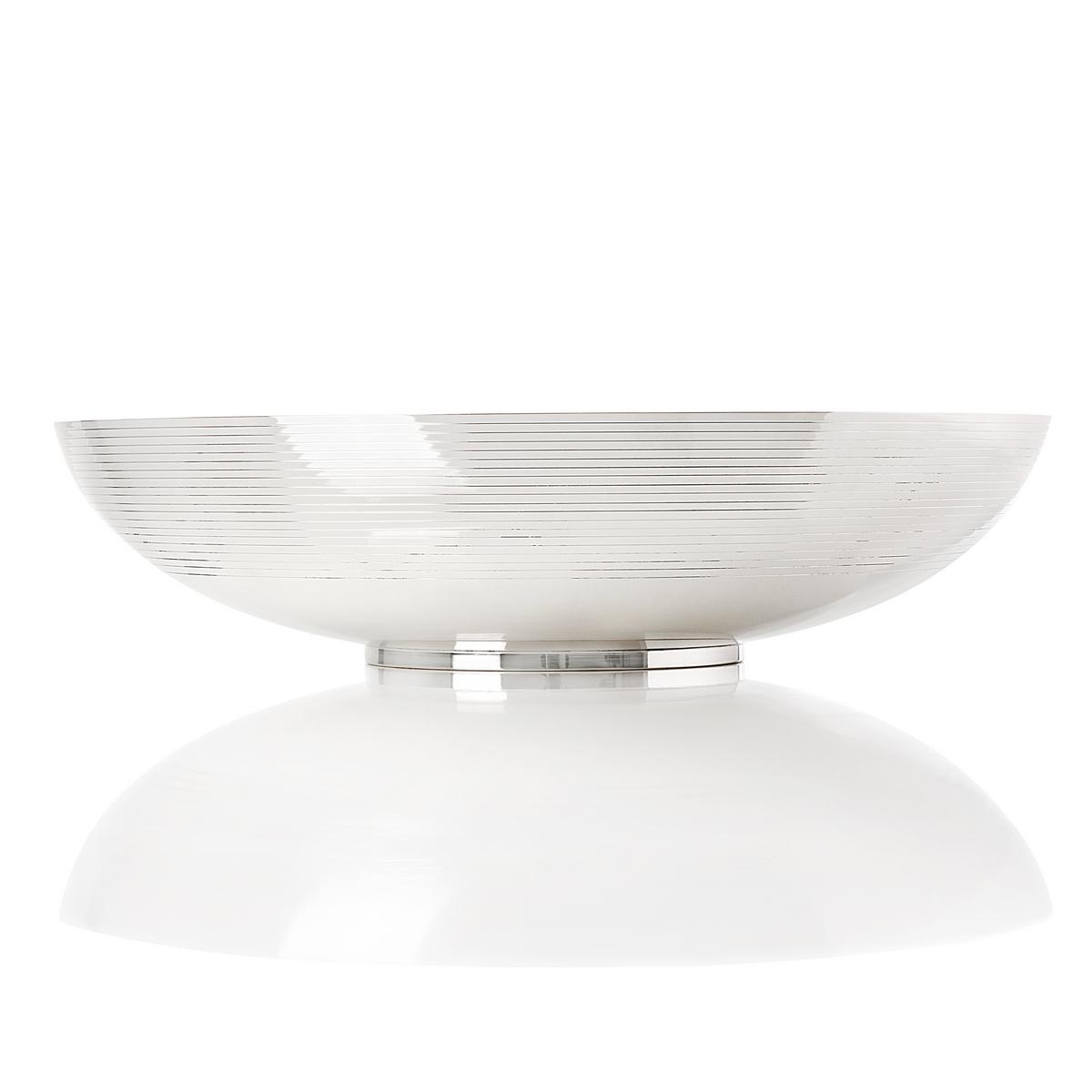 The "Transat" centrepiece from Ercuis is a real masterpiece of elegance and art deco design. The magnificent bowl is silverplated and has a diameter measuring 26 cm. About two thirds of the exterior surface displays finely engraved grooves. The bottom third has no engraving.
