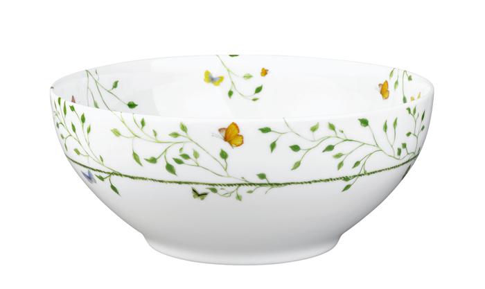 "Verspielt! Junge Triebe locken bunte Vögel und Schmetterlinge an. Gemeinsam bringen sie Lebensfreude auf blütenweißes Limoges-Porzellan."