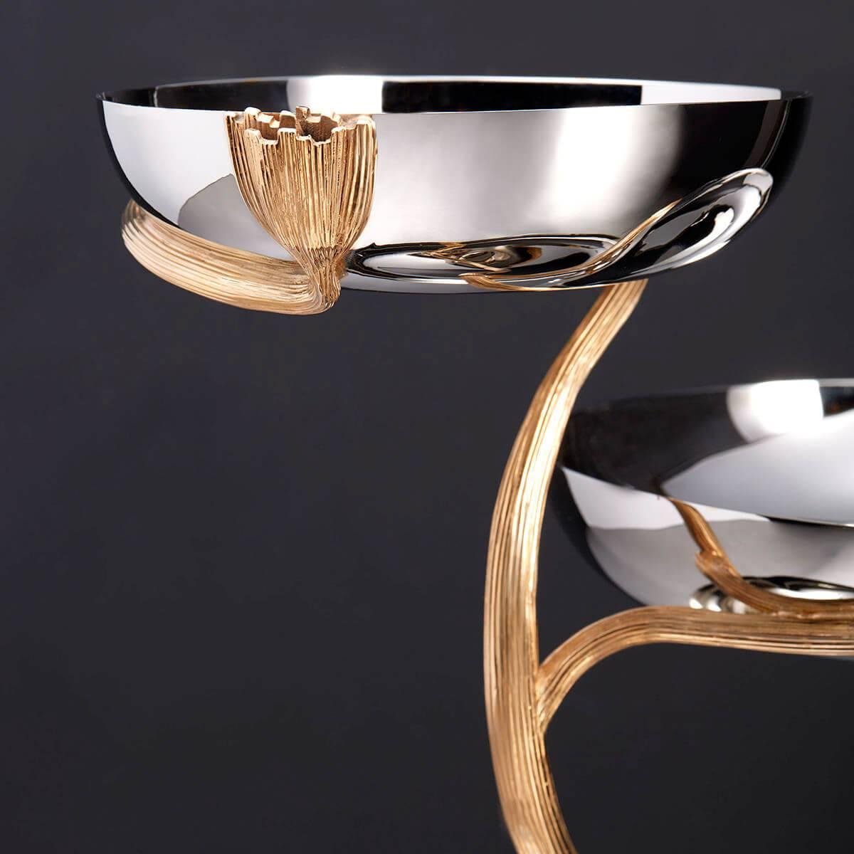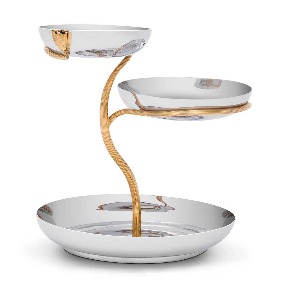 If you are looking for a slightly more flamboyant version of an cake stand, which can also serve as a deco object, then the "Deco Leaves" three-tiered cake stand from L’Objet is a perfect option. "Deco Leaves" from L’Objet combines polished stainless steel with golden accents in 24-carat gold. The gilded elements resemble a stylised petal. In the three different-sized dishes it is possible to present sweets, finger food and many other little treats in an attractive way.