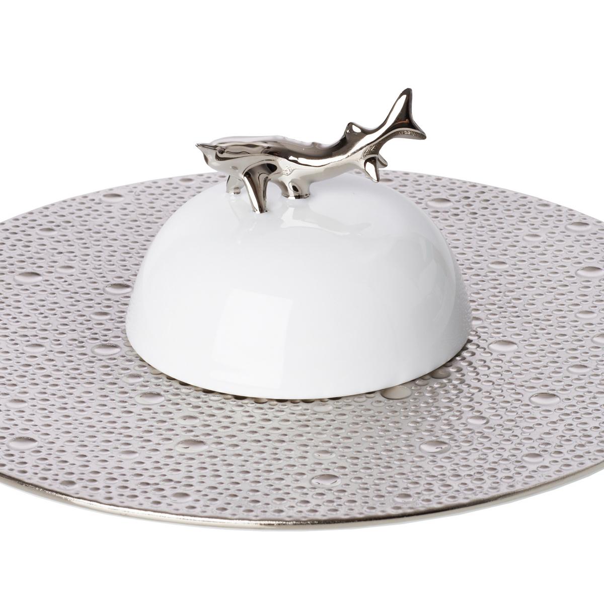 Custom-fit for the "Ecume" caviar bowls are Petrossian’s 30g and 50g blue caviar containers. These can be placed in the centre of the caviar bowl and covered with a cloche lid. The lid is also made of Limoges porcelain. Enthroned on the lid is a white, gold- or platinum-plated sturgeon. The Ecume caviar dishes come without caviar. Naturally, you can also put the caviar directly into the "Ecume" bowl from Bernardaud and present it effectively under the cloche lid. The diameter for the caviar is exactly 6.8 cm.