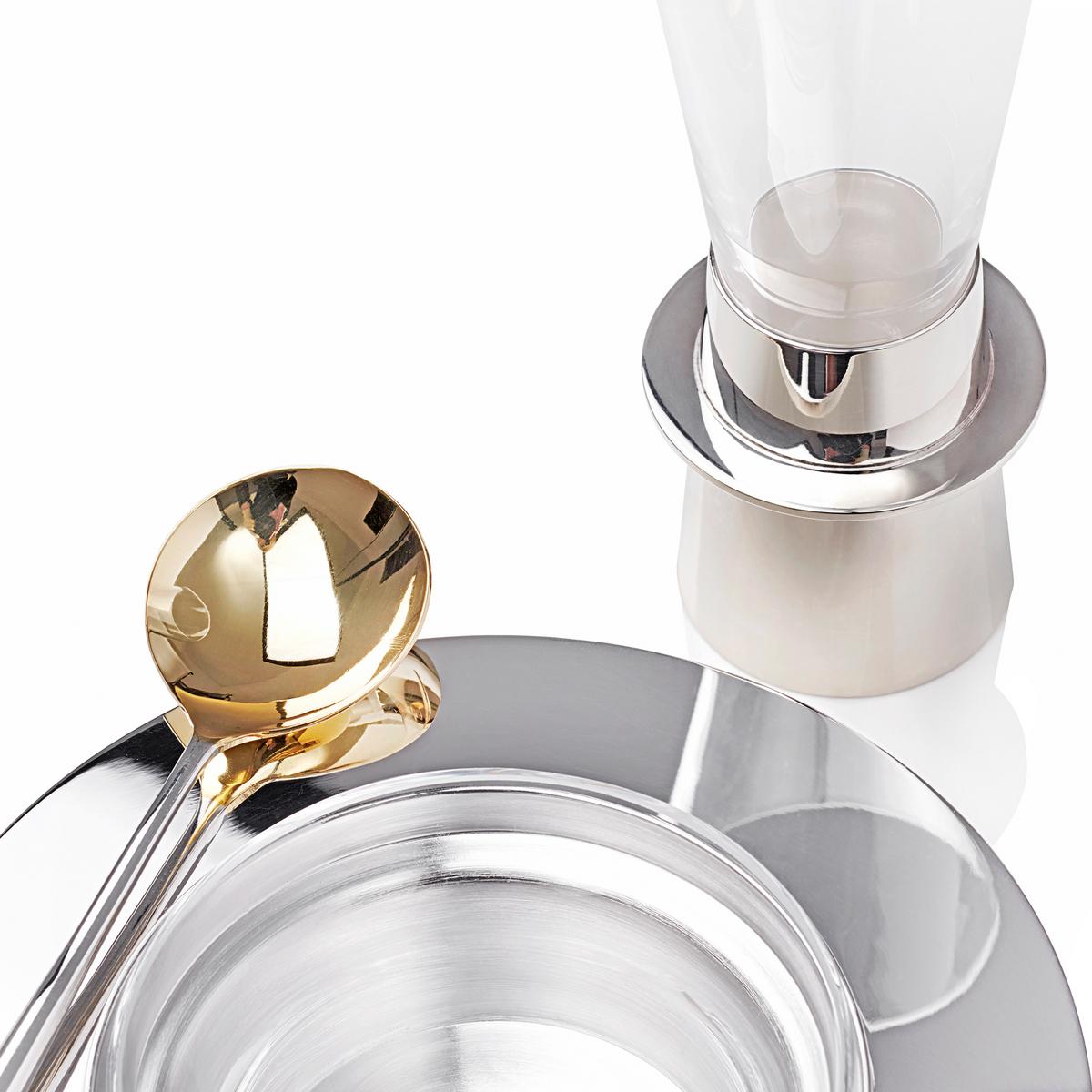 The French manufacturer Ercuis has conceived exactly the right serving ware to hold this delicacy's tiny pearls: The caviar bowl "Saturne" comprises a glass bowl (for 30g caviar) on a silverplated dish. There is a matching caviar spoon with a gold-plated head as well as a vodka glass enthroned on a silverplated stand. A trio which will delight true gourmets.