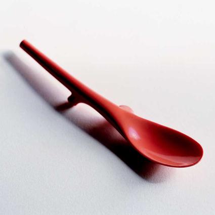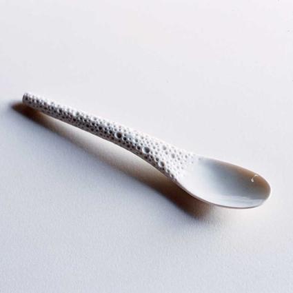 Designer Ted Muehling created these opulent porcelain caviar spoons for the Nymphenburg porcelain factory. The complex branched shape of the fiery orange spoon immediately conjures up pictures of Mediterranean coral. Sun-bleached coral, Ted Muehling found on the beach in the Caribbean, was the inspiration for the white perforated spoon. (Photographs by Don Freeman).
